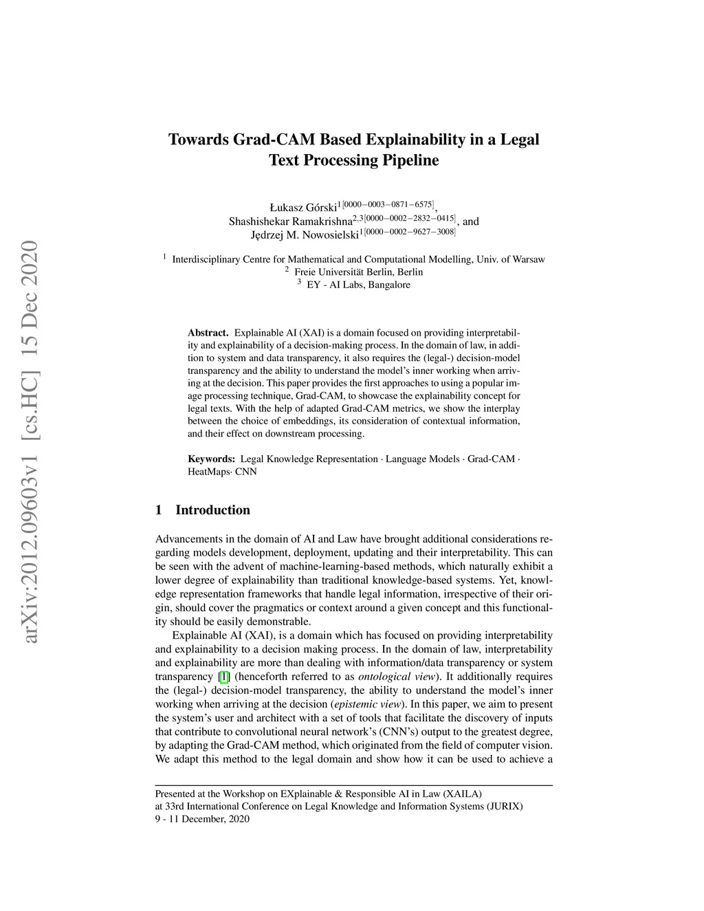Explainable AI(XAI)is a domain focused on providing interpretability and explainability of a decision-making process. In the domain of law, in addition to system and data transparency, it also requires the (legal-) decision-model transparency and the ability to understand the models inner working when arriving at the decision. This paper provides the first approaches to using a popular image processing technique, Grad-CAM, to showcase the explainability concept for legal texts. With the help of adapted Grad-CAM metrics, we show the interplay between the choice of embeddings, its consideration of contextual information, and their effect on downstream processing.