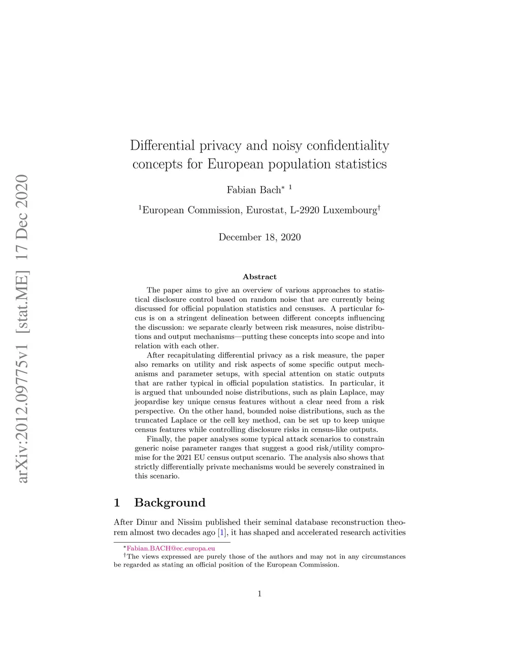 The paper aims to give an overview of various approaches to statistical disclosure control based on random noise that are currently being discussed for official population statistics and censuses. A particular focus is on a stringent delineation between different concepts influencing the discussion: we separate clearly between risk measures, noise distributions and output mechanisms - putting these concepts into scope and into relation with each other. After recapitulating differential privacy as a risk measure, the paper also remarks on utility and risk aspects of some specific output mechanisms and parameter setups, with special attention on static outputs that are rather typical in official population statistics. In particular, it is argued that unbounded noise distributions, such as plain Laplace, may jeopardise key unique census features without a clear need from a risk perspective. On the other hand, bounded noise distributions, such as the truncated Laplace or the cell key method, can be set up to keep unique census features while controlling disclosure risks in census-like outputs. Finally, the paper analyses some typical attack scenarios to constrain generic noise parameter ranges that suggest a good risk/utility compromise for the 2021 EU census output scenario. The analysis also shows that strictly differentially private mechanisms would be severely constrained in this scenario.