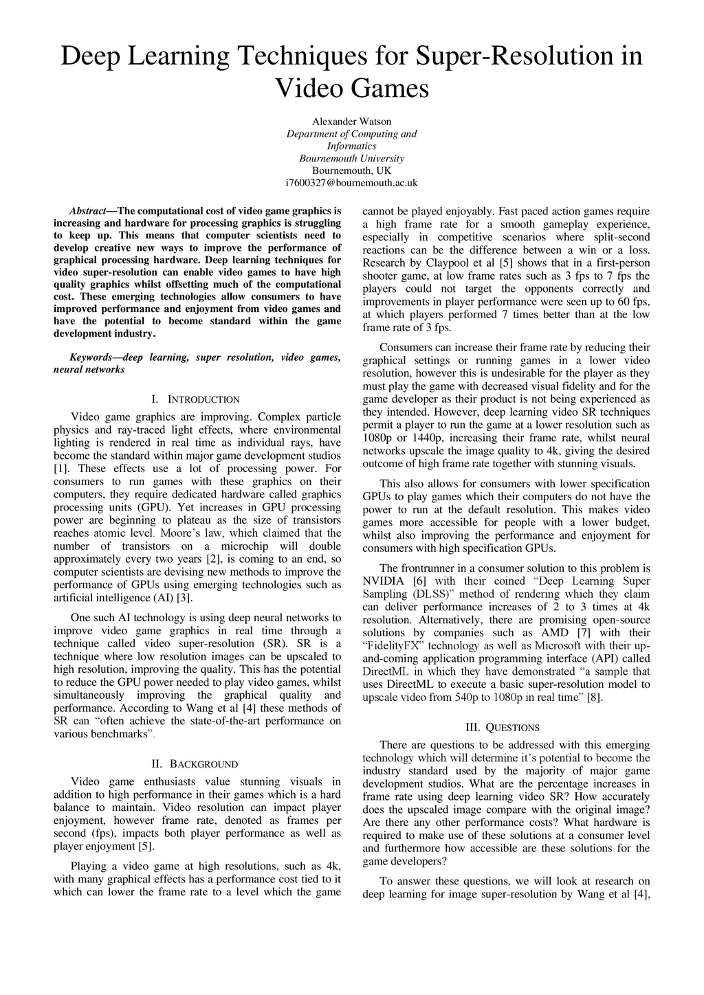 The computational cost of video game graphics is increasing and hardware for processing graphics is struggling to keep up. This means that computer scientists need to develop creative new ways to improve the performance of graphical processing hardware. Deep learning techniques for video super-resolution can enable video games to have high quality graphics whilst offsetting much of the computational cost. These emerging technologies allow consumers to have improved performance and enjoyment from video games and have the potential to become standard within the game development industry.