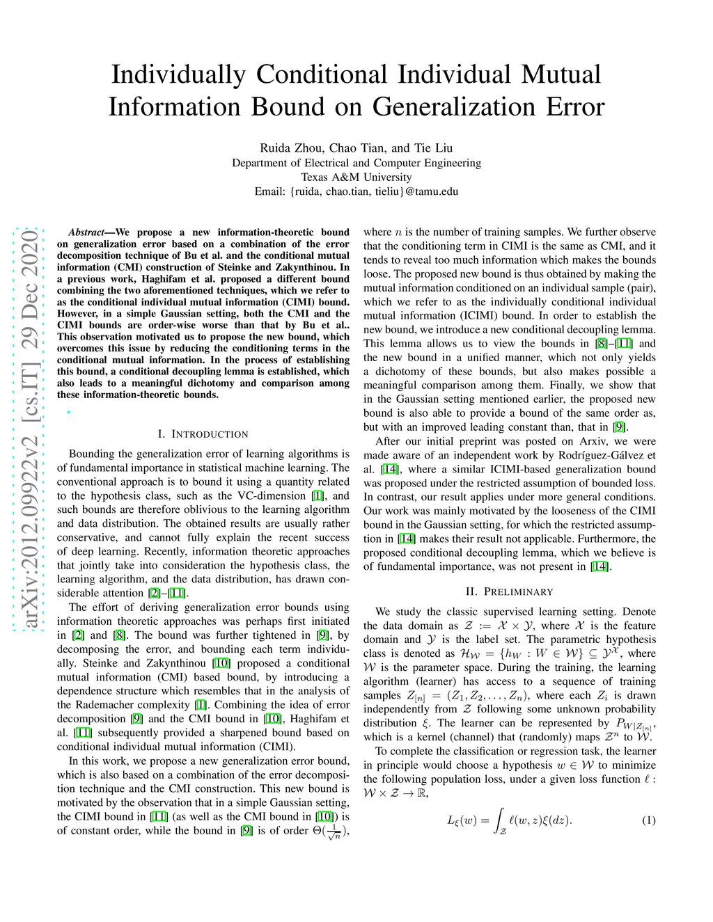 We propose a new information-theoretic bound on generalization error based on a combination of the error decomposition technique of Bu et al. and the conditional mutual information (CMI) construction of Steinke and Zakynthinou. In a previous work, Haghifam et al. proposed a different bound combining the two aforementioned techniques, which we refer to as the conditional individual mutual information (CIMI) bound. However, in a simple Gaussian setting, both the CMI and the CIMI bounds are order-wise worse than that by Bu et al.. This observation motivated us to propose the new bound, which overcomes this issue by reducing the conditioning terms in the conditional mutual information. In the process of establishing this bound, a conditional decoupling lemma is established, which also leads to a meaningful dichotomy and comparison among these information-theoretic bounds.
