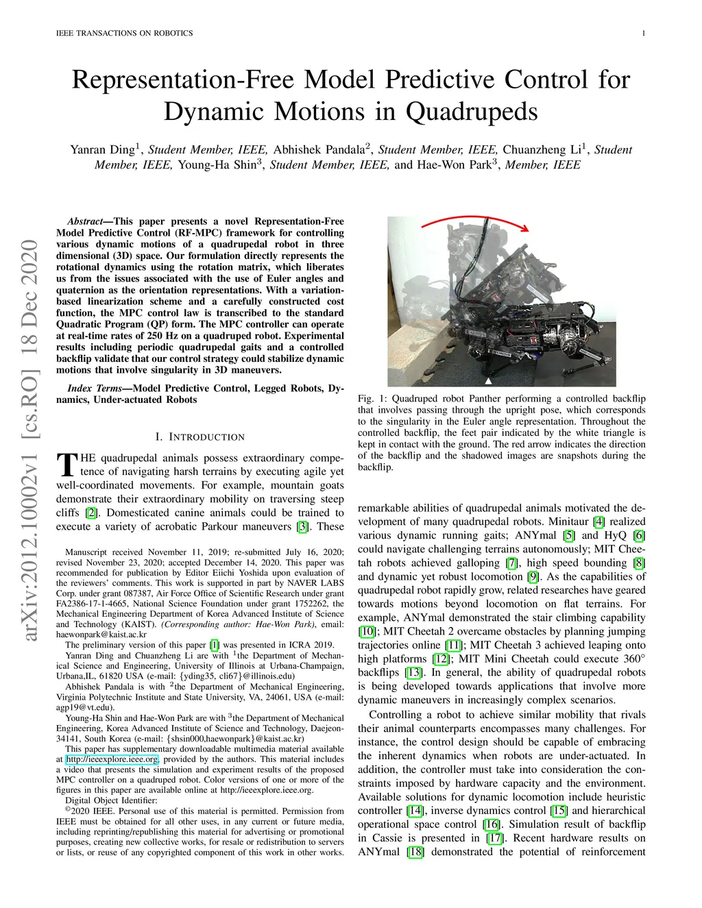 This paper presents a novel Representation-Free Model Predictive Control (RF-MPC) framework for controlling various dynamic motions of a quadrupedal robot in three dimensional (3D) space. Our formulation directly represents the rotational dynamics using the rotation matrix, which liberates us from the issues associated with the use of Euler angles and quaternion as the orientation representations. With a variation-based linearization scheme and a carefully constructed cost function, the MPC control law is transcribed to the standard Quadratic Program (QP) form. The MPC controller can operate at real-time rates of 250 Hz on a quadruped robot. Experimental results including periodic quadrupedal gaits and a controlled backflip validate that our control strategy could stabilize dynamic motions that involve singularity in 3D maneuvers.