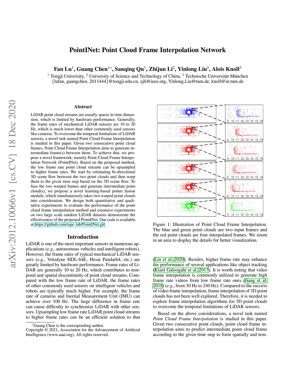 LiDAR point cloud streams are usually sparse in time dimension, which is limited by hardware performance. Generally, the frame rates of mechanical LiDAR sensors are 10 to 20 Hz, which is much lower than other commonly used sensors like cameras. To overcome the temporal limitations of LiDAR sensors, a novel task named Point Cloud Frame Interpolation is studied in this paper. Given two consecutive point cloud frames, Point Cloud Frame Interpolation aims to generate intermediate frame(s) between them. To achieve that, we propose a novel framework, namely Point Cloud Frame Interpolation Network (PointINet). Based on the proposed method, the low frame rate point cloud streams can be upsampled to higher frame rates. We start by estimating bi-directional 3D scene flow between the two point clouds and then warp them to the given time step based on the 3D scene flow. To fuse the two warped frames and generate intermediate point cloud(s), we propose a novel learning-based points fusion module, which simultaneously takes two warped point clouds into consideration. We design both quantitative and qualitative experiments to evaluate the performance of the point cloud frame interpolation method and extensive experiments on two large scale outdoor LiDAR datasets demonstrate the effectiveness of the proposed PointINet. Our code is available at https://github.com/ispc-lab/PointINet.git.