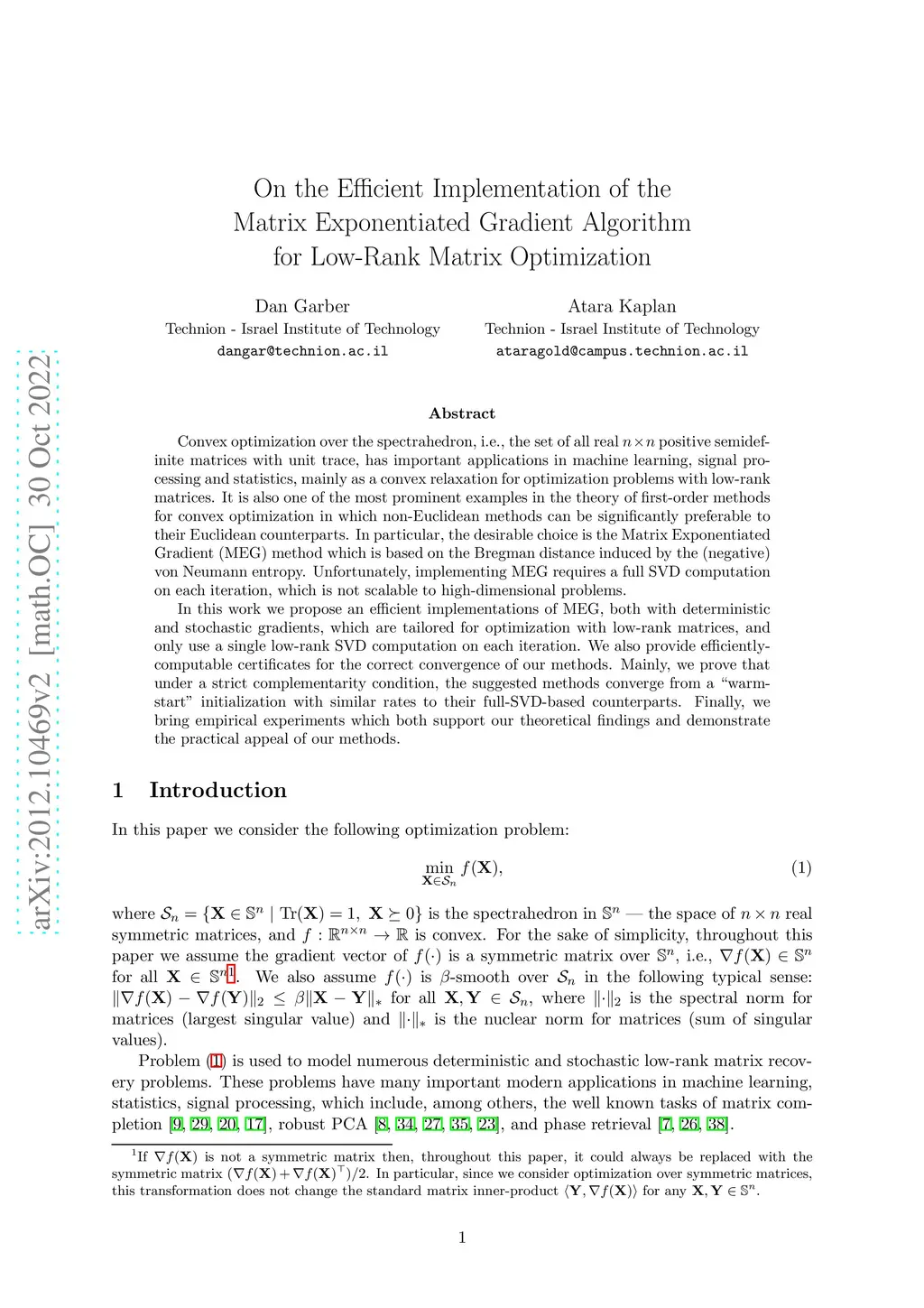 Convex optimization over the spectrahedron, i.e., the set of all real positive semidefinite matrices with unit trace, has important applications in machine learning, signal processing and statistics, mainly as a convex relaxation for optimization with low-rank matrices. It is also one of the most prominent examples in the theory of first-order methods for convex optimization in which non-Euclidean methods can be significantly preferable to their Euclidean counterparts, and in particular the Matrix Exponentiated Gradient (MEG) method which is based on the Bregman distance induced by the (negative) von Neumann entropy. Unfortunately, implementing MEG requires a full SVD computation on each iteration, which is not scalable to high-dimensional problems. In this work we propose efficient implementations of MEG, both with deterministic and stochastic gradients, which are tailored for optimization with low-rank matrices, and only use a single low-rank SVD computation on each iteration. We also provide efficiently-computable certificates for the correct convergence of our methods. Mainly, we prove that under a strict complementarity condition, the suggested methods converge from a "warm-start" initialization with similar rates to their full-SVD-based counterparts. Finally, we bring empirical experiments which both support our theoretical findings and demonstrate the practical appeal of our methods.