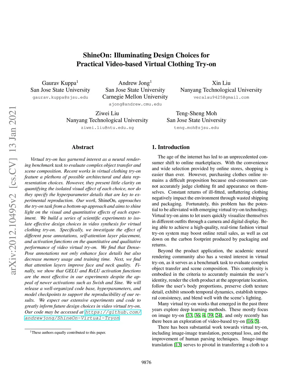 Virtual try-on has garnered interest as a neural rendering benchmark task to evaluate complex object transfer and scene composition. Recent works in virtual clothing try-on feature a plethora of possible architectural and data representation choices. However, they present little clarity on quantifying the isolated visual effect of each choice, nor do they specify the hyperparameter details that are key to experimental reproduction. Our work, ShineOn, approaches the try-on task from a bottom-up approach and aims to shine light on the visual and quantitative effects of each experiment. We build a series of scientific experiments to isolate effective design choices in video synthesis for virtual clothing try-on. Specifically, we investigate the effect of different pose annotations, self-attention layer placement, and activation functions on the quantitative and qualitative performance of video virtual try-on. We find that DensePose annotations not only enhance face details but also decrease memory usage and training time. Next, we find that attention layers improve face and neck quality. Finally, we show that GELU and ReLU activation functions are the most effective in our experiments despite the appeal of newer activations such as Swish and Sine. We will release a well-organized code base, hyperparameters, and model checkpoints to support the reproducibility of our results. We expect our extensive experiments and code to greatly inform future design choices in video virtual try-on. Our code may be accessed at https://github.com/andrewjong/ShineOn-Virtual-Tryon.