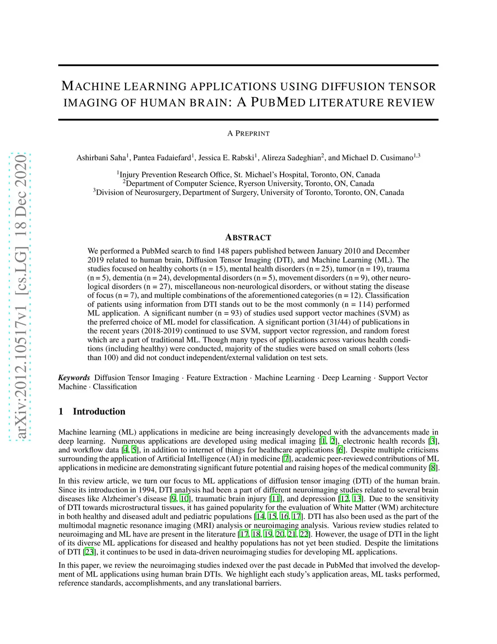 We performed a PubMed search to find 148 papers published between January 2010 and December 2019 related to human brain, Diffusion Tensor Imaging (DTI), and Machine Learning (ML). The studies focused on healthy cohorts (n = 15), mental health disorders (n = 25), tumor (n = 19), trauma (n = 5), dementia (n = 24), developmental disorders (n = 5), movement disorders (n = 9), other neurological disorders (n = 27), miscellaneous non-neurological disorders, or without stating the disease of focus (n = 7), and multiple combinations of the aforementioned categories (n = 12). Classification of patients using information from DTI stands out to be the most commonly (n = 114) performed ML application. A significant number (n = 93) of studies used support vector machines (SVM) as the preferred choice of ML model for classification. A significant portion (31/44) of publications in the recent years (2018-2019) continued to use SVM, support vector regression, and random forest which are a part of traditional ML. Though many types of applications across various health conditions (including healthy) were conducted, majority of the studies were based on small cohorts (less than 100) and did not conduct independent/external validation on test sets.