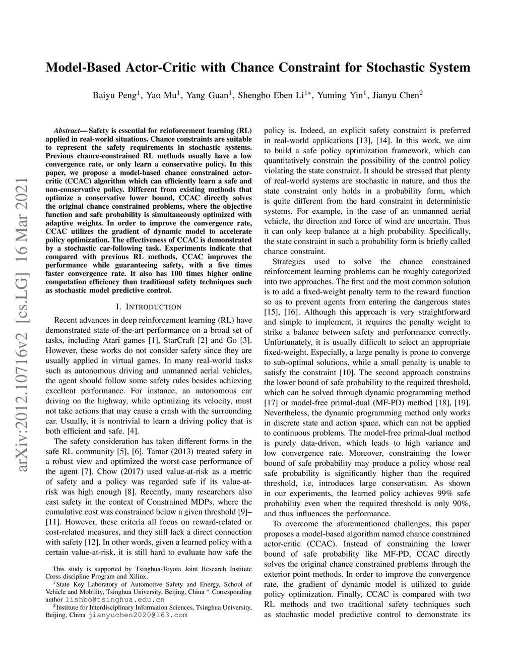 Model-Based Actor-Critic with Chance Constraint for Stochastic System