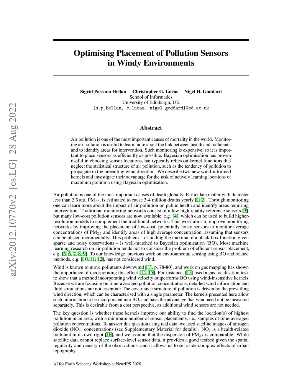 Air pollution is one of the most important causes of mortality in the world. Monitoring air pollution is useful to learn more about the link between health and pollutants, and to identify areas for intervention. Such monitoring is expensive, so it is important to place sensors as efficiently as possible. Bayesian optimisation has proven useful in choosing sensor locations, but typically relies on kernel functions that neglect the statistical structure of air pollution, such as the tendency of pollution to propagate in the prevailing wind direction. We describe two new wind-informed kernels and investigate their advantage for the task of actively learning locations of maximum pollution using Bayesian optimisation.