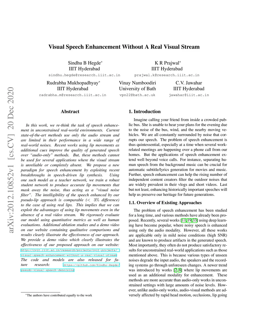 In this work, we re-think the task of speech enhancement in unconstrained real-world environments. Current state-of-the-art methods use only the audio stream and are limited in their performance in a wide range of real-world noises. Recent works using lip movements as additional cues improve the quality of generated speech over "audio-only" methods. But, these methods cannot be used for several applications where the visual stream is unreliable or completely absent. We propose a new paradigm for speech enhancement by exploiting recent breakthroughs in speech-driven lip synthesis. Using one such model as a teacher network, we train a robust student network to produce accurate lip movements that mask away the noise, thus acting as a "visual noise filter". The intelligibility of the speech enhanced by our pseudo-lip approach is comparable (< 3% difference) to the case of using real lips. This implies that we can exploit the advantages of using lip movements even in the absence of a real video stream. We rigorously evaluate our model using quantitative metrics as well as human evaluations. Additional ablation studies and a demo video on our website containing qualitative comparisons and results clearly illustrate the effectiveness of our approach. We provide a demo video which clearly illustrates the effectiveness of our proposed approach on our website: \url{http://cvit.iiit.ac.in/research/projects/cvit-projects/visual-speech-enhancement-without-a-real-visual-stream}. The code and models are also released for future research: \url{https://github.com/Sindhu-Hegde/pseudo-visual-speech-denoising}.