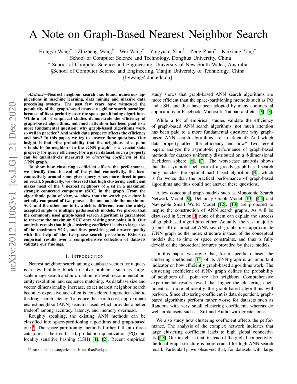 Nearest neighbor search has found numerous applications in machine learning, data mining and massive data processing systems. The past few years have witnessed the popularity of the graph-based nearest neighbor search paradigm because of its superiority over the space-partitioning algorithms. While a lot of empirical studies demonstrate the efficiency of graph-based algorithms, not much attention has been paid to a more fundamental question: why graph-based algorithms work so well in practice? And which data property affects the efficiency and how? In this paper, we try to answer these questions. Our insight is that "the probability that the neighbors of a point o tends to be neighbors in the KNN graph" is a crucial data property for query efficiency. For a given dataset, such a property can be qualitatively measured by clustering coefficient of the KNN graph. To show how clustering coefficient affects the performance, we identify that, instead of the global connectivity, the local connectivity around some given query q has more direct impact on recall. Specifically, we observed that high clustering coefficient makes most of the k nearest neighbors of q sit in a maximum strongly connected component (SCC) in the graph. From the algorithmic point of view, we show that the search procedure is actually composed of two phases - the one outside the maximum SCC and the other one in it, which is different from the widely accepted single or multiple paths search models. We proved that the commonly used graph-based search algorithm is guaranteed to traverse the maximum SCC once visiting any point in it. Our analysis reveals that high clustering coefficient leads to large size of the maximum SCC, and thus provides good answer quality with the help of the two-phase search procedure. Extensive empirical results over a comprehensive collection of datasets validate our findings.