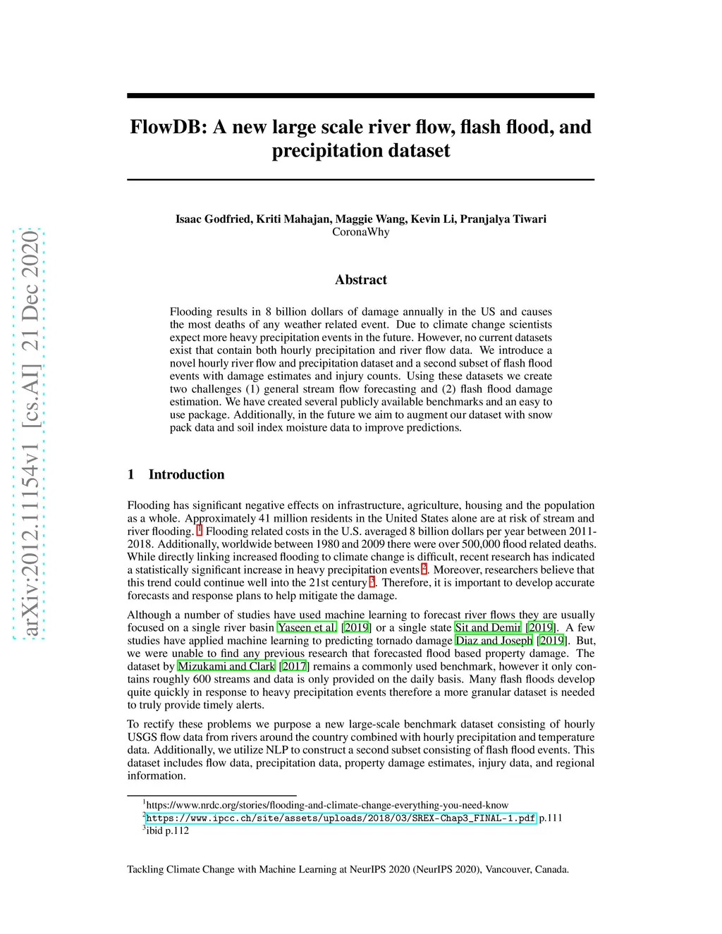 Flooding results in 8 billion dollars of damage annually in the US and causes the most deaths of any weather related event. Due to climate change scientists expect more heavy precipitation events in the future. However, no current datasets exist that contain both hourly precipitation and river flow data. We introduce a novel hourly river flow and precipitation dataset and a second subset of flash flood events with damage estimates and injury counts. Using these datasets we create two challenges (1) general stream flow forecasting and (2) flash flood damage estimation. We have created several publicly available benchmarks and an easy to use package. Additionally, in the future we aim to augment our dataset with snow pack data and soil index moisture data to improve predictions.