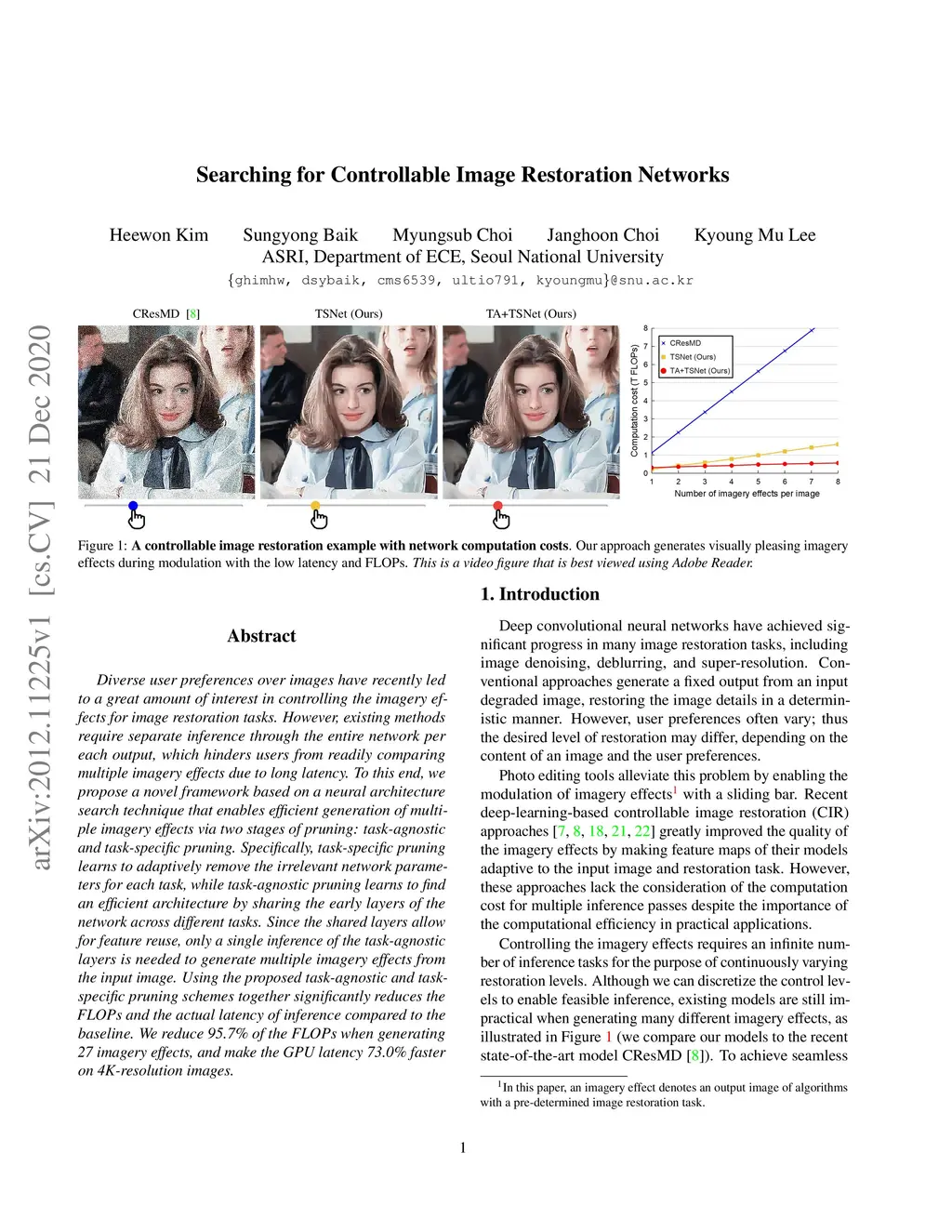 Diverse user preferences over images have recently led to a great amount of interest in controlling the imagery effects for image restoration tasks. However, existing methods require separate inference through the entire network per each output, which hinders users from readily comparing multiple imagery effects due to long latency. To this end, we propose a novel framework based on a neural architecture search technique that enables efficient generation of multiple imagery effects via two stages of pruning: task-agnostic and task-specific pruning. Specifically, task-specific pruning learns to adaptively remove the irrelevant network parameters for each task, while task-agnostic pruning learns to find an efficient architecture by sharing the early layers of the network across different tasks. Since the shared layers allow for feature reuse, only a single inference of the task-agnostic layers is needed to generate multiple imagery effects from the input image. Using the proposed task-agnostic and task-specific pruning schemes together significantly reduces the FLOPs and the actual latency of inference compared to the baseline. We reduce 95.7% of the FLOPs when generating 27 imagery effects, and make the GPU latency 73.0% faster on 4K-resolution images.
