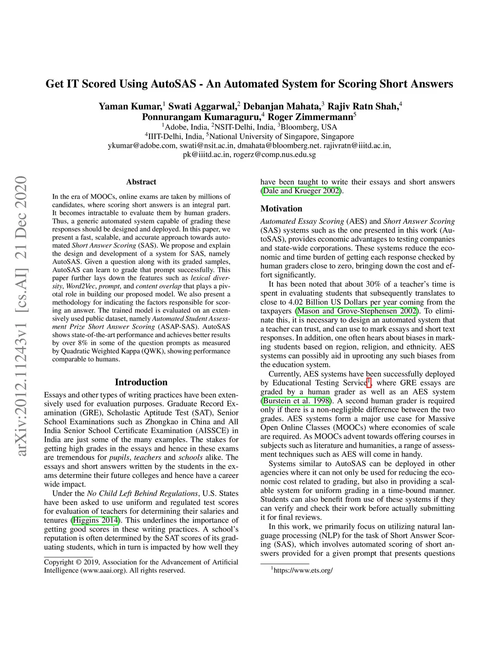 In the era of MOOCs, online exams are taken by millions of candidates, where scoring short answers is an integral part. It becomes intractable to evaluate them by human graders. Thus, a generic automated system capable of grading these responses should be designed and deployed. In this paper, we present a fast, scalable, and accurate approach towards automated Short Answer Scoring (SAS). We propose and explain the design and development of a system for SAS, namely AutoSAS. Given a question along with its graded samples, AutoSAS can learn to grade that prompt successfully. This paper further lays down the features such as lexical diversity, Word2Vec, prompt, and content overlap that plays a pivotal role in building our proposed model. We also present a methodology for indicating the factors responsible for scoring an answer. The trained model is evaluated on an extensively used public dataset, namely Automated Student Assessment Prize Short Answer Scoring (ASAP-SAS). AutoSAS shows state-of-the-art performance and achieves better results by over 8% in some of the question prompts as measured by Quadratic Weighted Kappa (QWK), showing performance comparable to humans.