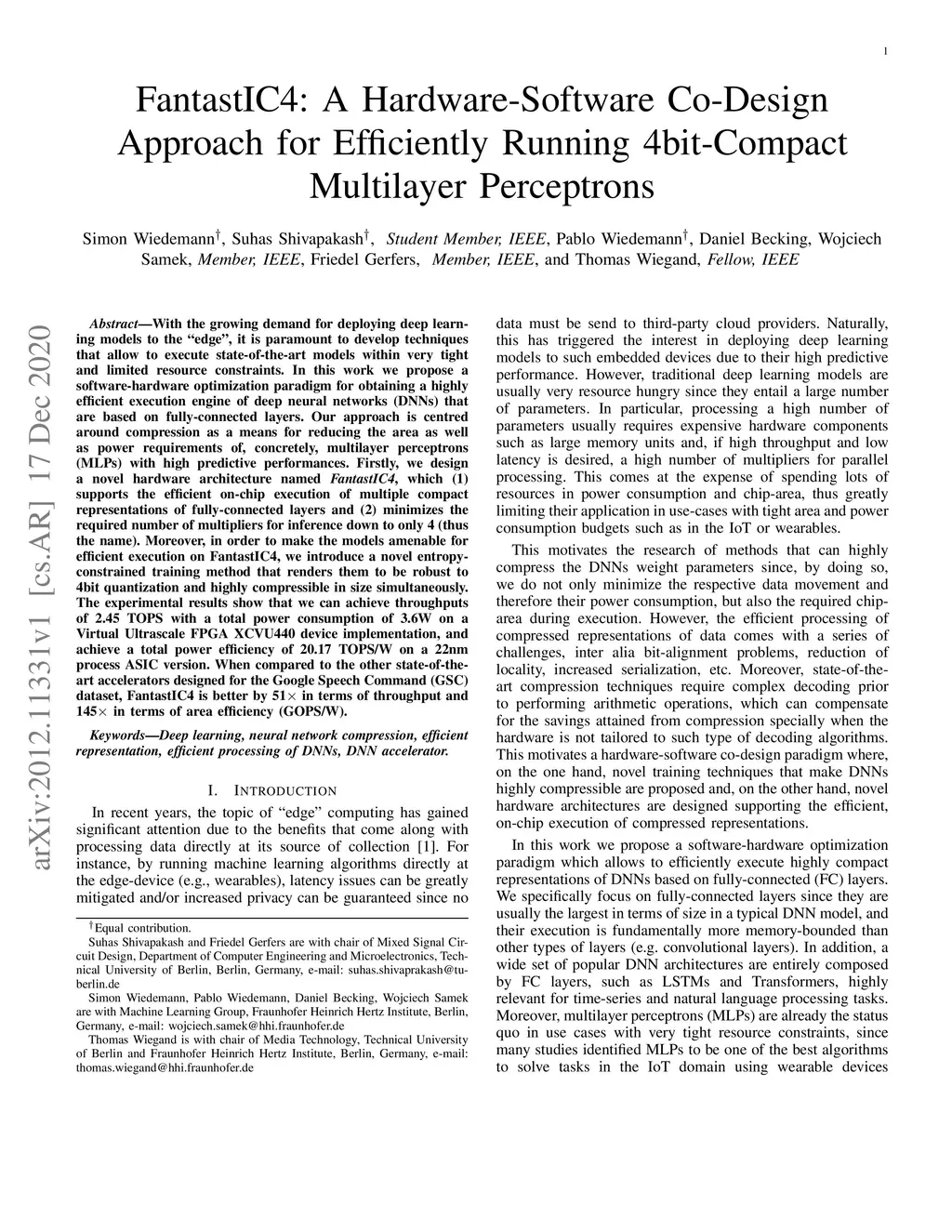 With the growing demand for deploying deep learning models to the "edge", it is paramount to develop techniques that allow to execute state-of-the-art models within very tight and limited resource constraints. In this work we propose a software-hardware optimization paradigm for obtaining a highly efficient execution engine of deep neural networks (DNNs) that are based on fully-connected layers. Our approach is centred around compression as a means for reducing the area as well as power requirements of, concretely, multilayer perceptrons (MLPs) with high predictive performances. Firstly, we design a novel hardware architecture named FantastIC4, which (1) supports the efficient on-chip execution of multiple compact representations of fully-connected layers and (2) minimizes the required number of multipliers for inference down to only 4 (thus the name). Moreover, in order to make the models amenable for efficient execution on FantastIC4, we introduce a novel entropy-constrained training method that renders them to be robust to 4bit quantization and highly compressible in size simultaneously. The experimental results show that we can achieve throughputs of 2.45 TOPS with a total power consumption of 3.6W on a Virtual Ultrascale FPGA XCVU440 device implementation, and achieve a total power efficiency of 20.17 TOPS/W on a 22nm process ASIC version. When compared to the other state-of-the-art accelerators designed for the Google Speech Command (GSC) dataset, FantastIC4 is better by 51 in terms of throughput and 145 in terms of area efficiency (GOPS/W).