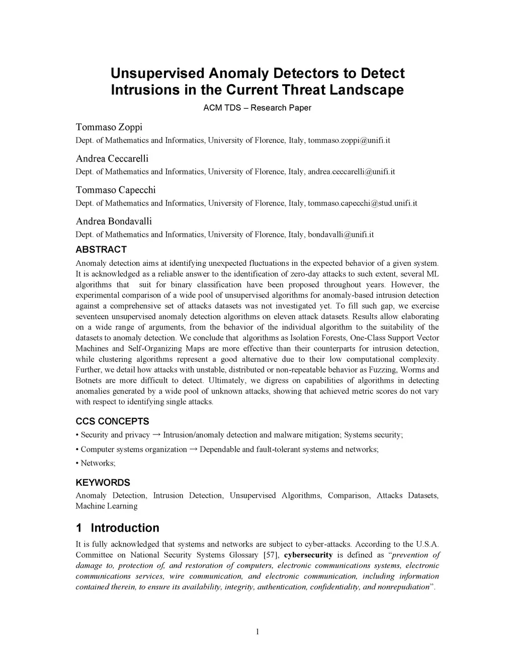 Unsupervised Anomaly Detectors to Detect Intrusions in the Current