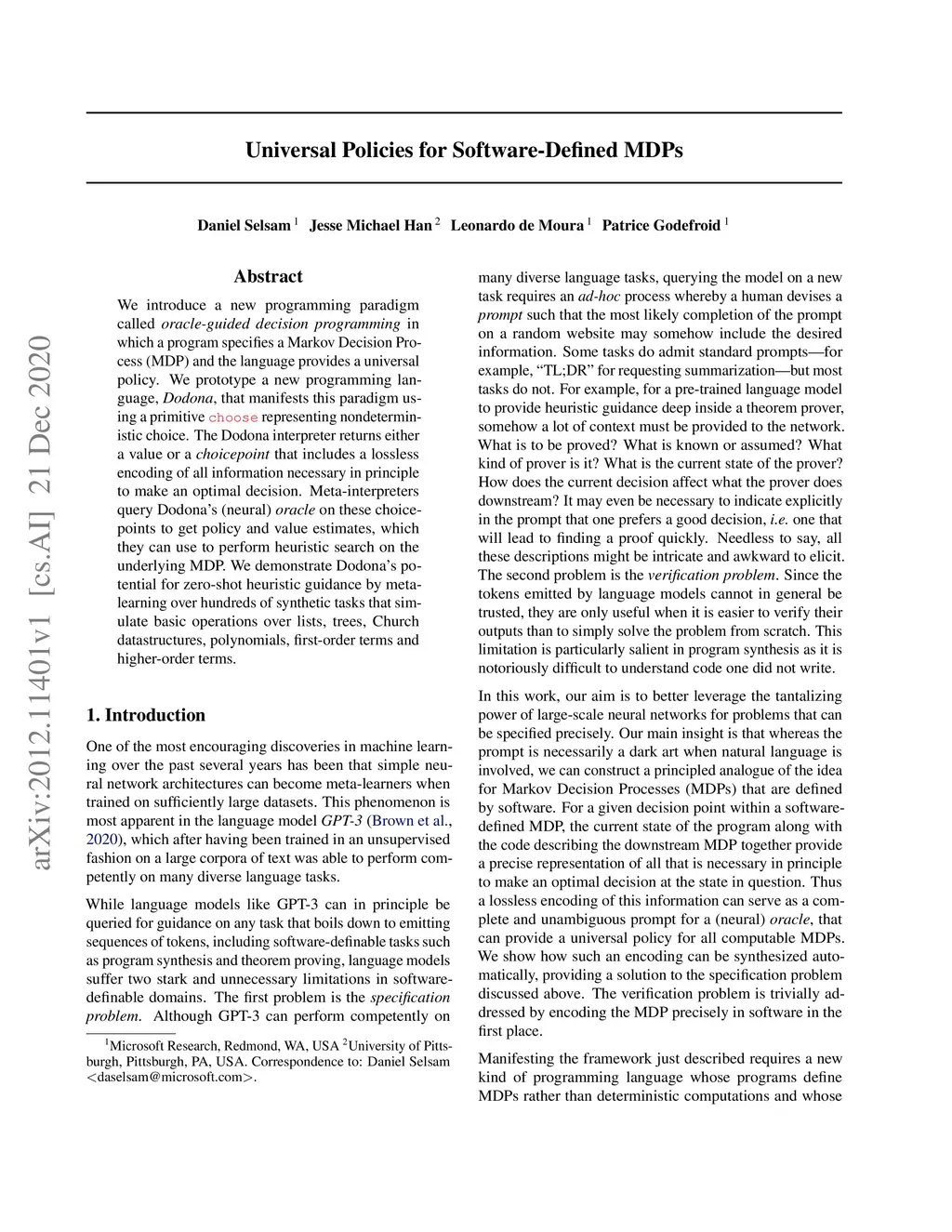 We introduce a new programming paradigm called oracle-guided decision programming in which a program specifies a Markov Decision Process (MDP) and the language provides a universal policy. We prototype a new programming language, Dodona, that manifests this paradigm using a primitive 'choose' representing nondeterministic choice. The Dodona interpreter returns either a value or a choicepoint that includes a lossless encoding of all information necessary in principle to make an optimal decision. Meta-interpreters query Dodona's (neural) oracle on these choicepoints to get policy and value estimates, which they can use to perform heuristic search on the underlying MDP. We demonstrate Dodona's potential for zero-shot heuristic guidance by meta-learning over hundreds of synthetic tasks that simulate basic operations over lists, trees, Church datastructures, polynomials, first-order terms and higher-order terms.