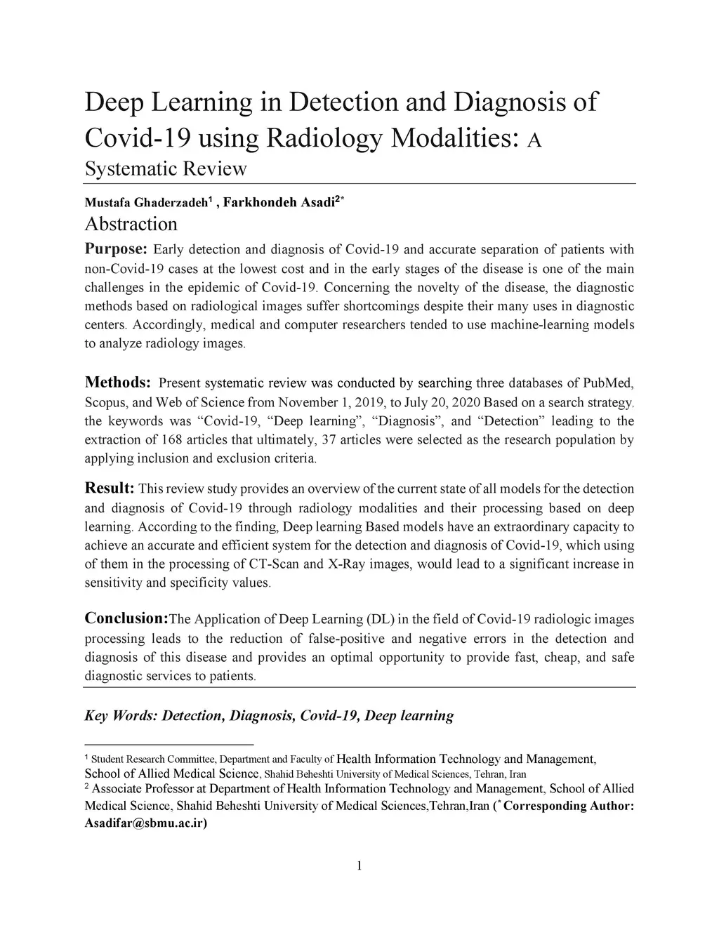 Purpose: Early detection and diagnosis of Covid-19 and accurate separation of patients with non-Covid-19 cases at the lowest cost and in the early stages of the disease are one of the main challenges in the epidemic of Covid-19. Concerning the novelty of the disease, the diagnostic methods based on radiological images suffer shortcomings despite their many uses in diagnostic centers. Accordingly, medical and computer researchers tended to use machine-learning models to analyze radiology images. Methods: Present systematic review was conducted by searching three databases of PubMed, Scopus, and Web of Science from November 1, 2019, to July 20, 2020 Based on a search strategy, the keywords were Covid-19, Deep learning, Diagnosis and Detection leading to the extraction of 168 articles that ultimately, 37 articles were selected as the research population by applying inclusion and exclusion criteria. Result: This review study provides an overview of the current state of all models for the detection and diagnosis of Covid-19 through radiology modalities and their processing based on deep learning. According to the finding, Deep learning Based models have an extraordinary capacity to achieve an accurate and efficient system for the detection and diagnosis of Covid-19, which using of them in the processing of CT-Scan and X-Ray images, would lead to a significant increase in sensitivity and specificity values. Conclusion: The Application of Deep Learning (DL) in the field of Covid-19 radiologic image processing leads to the reduction of false-positive and negative errors in the detection and diagnosis of this disease and provides an optimal opportunity to provide fast, cheap, and safe diagnostic services to patients.