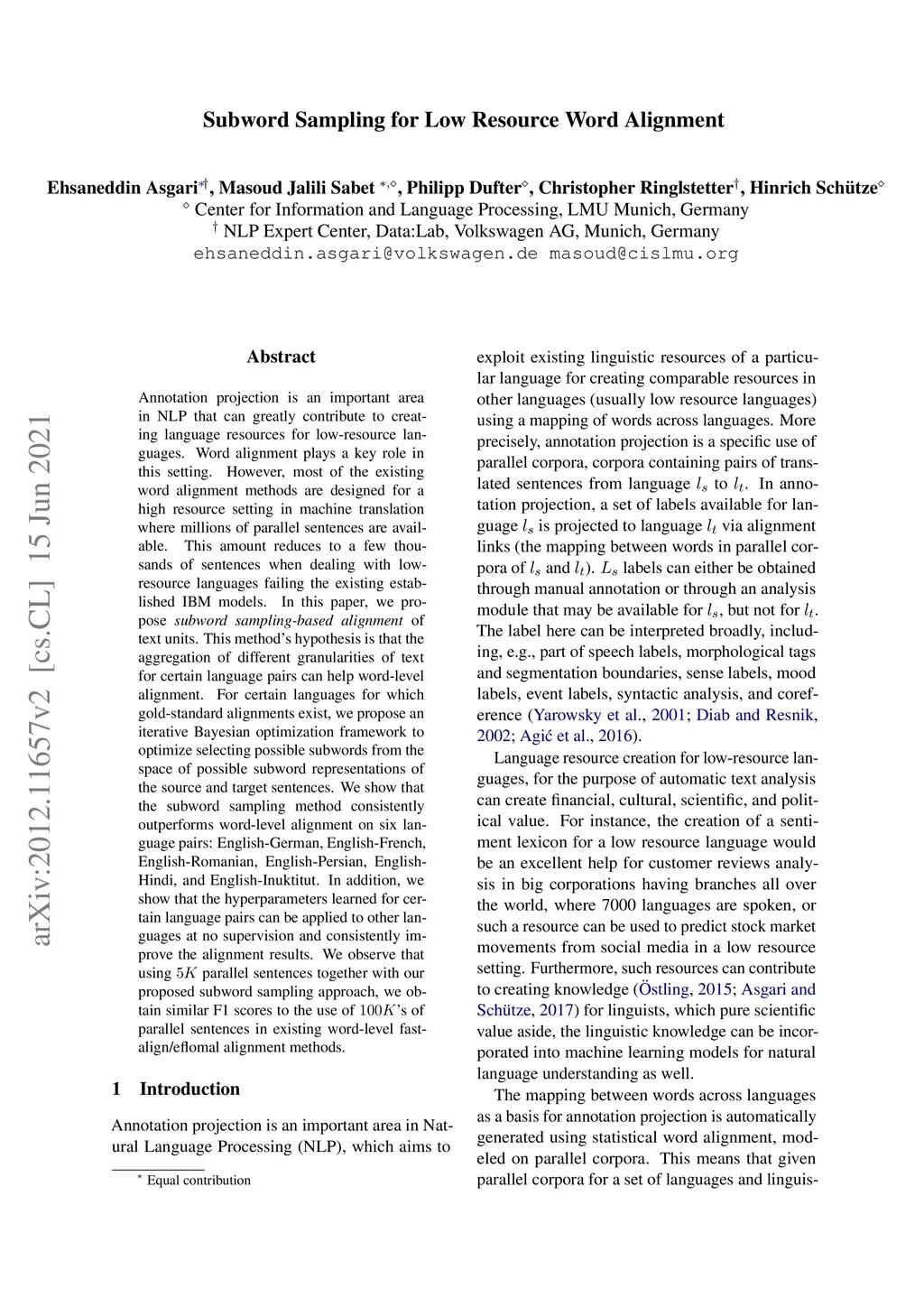 Annotation projection is an important area in NLP that can greatly contribute to creating language resources for low-resource languages. Word alignment plays a key role in this setting. However, most of the existing word alignment methods are designed for a high resource setting in machine translation where millions of parallel sentences are available. This amount reduces to a few thousands of sentences when dealing with low-resource languages failing the existing established IBM models. In this paper, we propose subword sampling-based alignment of text units. This method's hypothesis is that the aggregation of different granularities of text for certain language pairs can help word-level alignment. For certain languages for which gold-standard alignments exist, we propose an iterative Bayesian optimization framework to optimize selecting possible subwords from the space of possible subword representations of the source and target sentences. We show that the subword sampling method consistently outperforms word-level alignment on six language pairs: English-German, English-French, English-Romanian, English-Persian, English-Hindi, and English-Inuktitut. In addition, we show that the hyperparameters learned for certain language pairs can be applied to other languages at no supervision and consistently improve the alignment results. We observe that using parallel sentences together with our proposed subword sampling approach, we obtain similar F1 scores to the use of 's of parallel sentences in existing word-level fast-align/eflomal alignment methods.