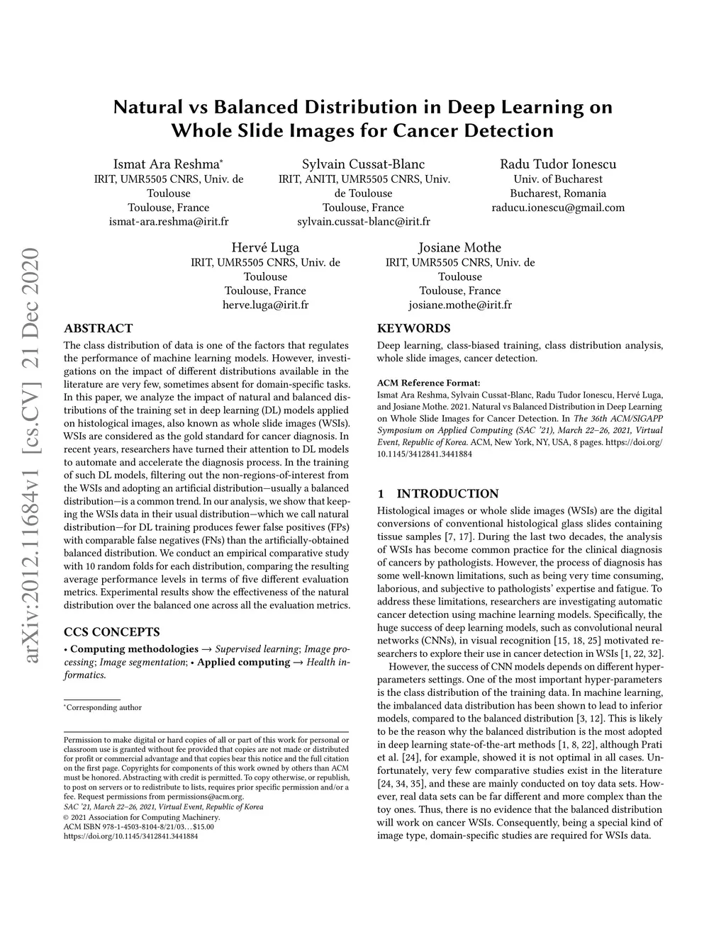Natural vs Balanced Distribution in Deep Learning on Whole Slide Images