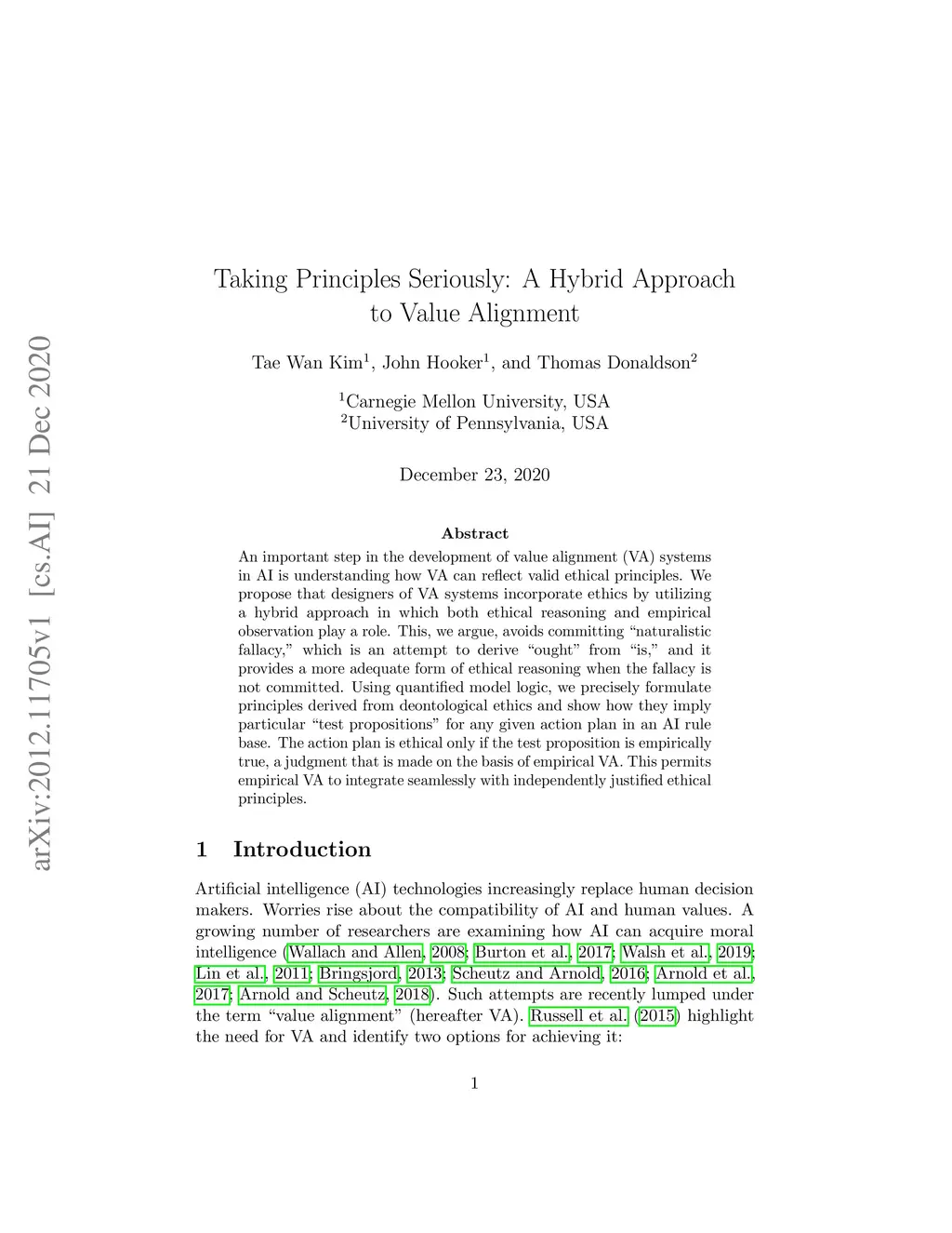 An important step in the development of value alignment (VA) systems in AI is understanding how VA can reflect valid ethical principles. We propose that designers of VA systems incorporate ethics by utilizing a hybrid approach in which both ethical reasoning and empirical observation play a role. This, we argue, avoids committing the "naturalistic fallacy," which is an attempt to derive "ought" from "is," and it provides a more adequate form of ethical reasoning when the fallacy is not committed. Using quantified model logic, we precisely formulate principles derived from deontological ethics and show how they imply particular "test propositions" for any given action plan in an AI rule base. The action plan is ethical only if the test proposition is empirically true, a judgment that is made on the basis of empirical VA. This permits empirical VA to integrate seamlessly with independently justified ethical principles.