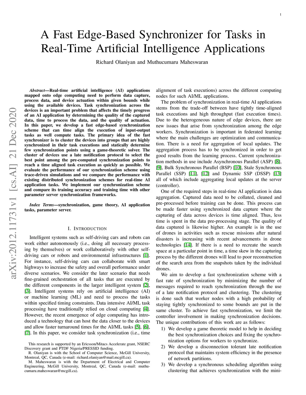 Real-time artificial intelligence (AI) applications mapped onto edge computing need to perform data capture, process data, and device actuation within given bounds while using the available devices. Task synchronization across the devices is an important problem that affects the timely progress of an AI application by determining the quality of the captured data, time to process the data, and the quality of actuation. In this paper, we develop a fast edge-based synchronization scheme that can time align the execution of input-output tasks as well compute tasks. The primary idea of the fast synchronizer is to cluster the devices into groups that are highly synchronized in their task executions and statically determine few synchronization points using a game-theoretic solver. The cluster of devices use a late notification protocol to select the best point among the pre-computed synchronization points to reach a time aligned task execution as quickly as possible. We evaluate the performance of our synchronization scheme using trace-driven simulations and we compare the performance with existing distributed synchronization schemes for real-time AI application tasks. We implement our synchronization scheme and compare its training accuracy and training time with other parameter server synchronization frameworks.