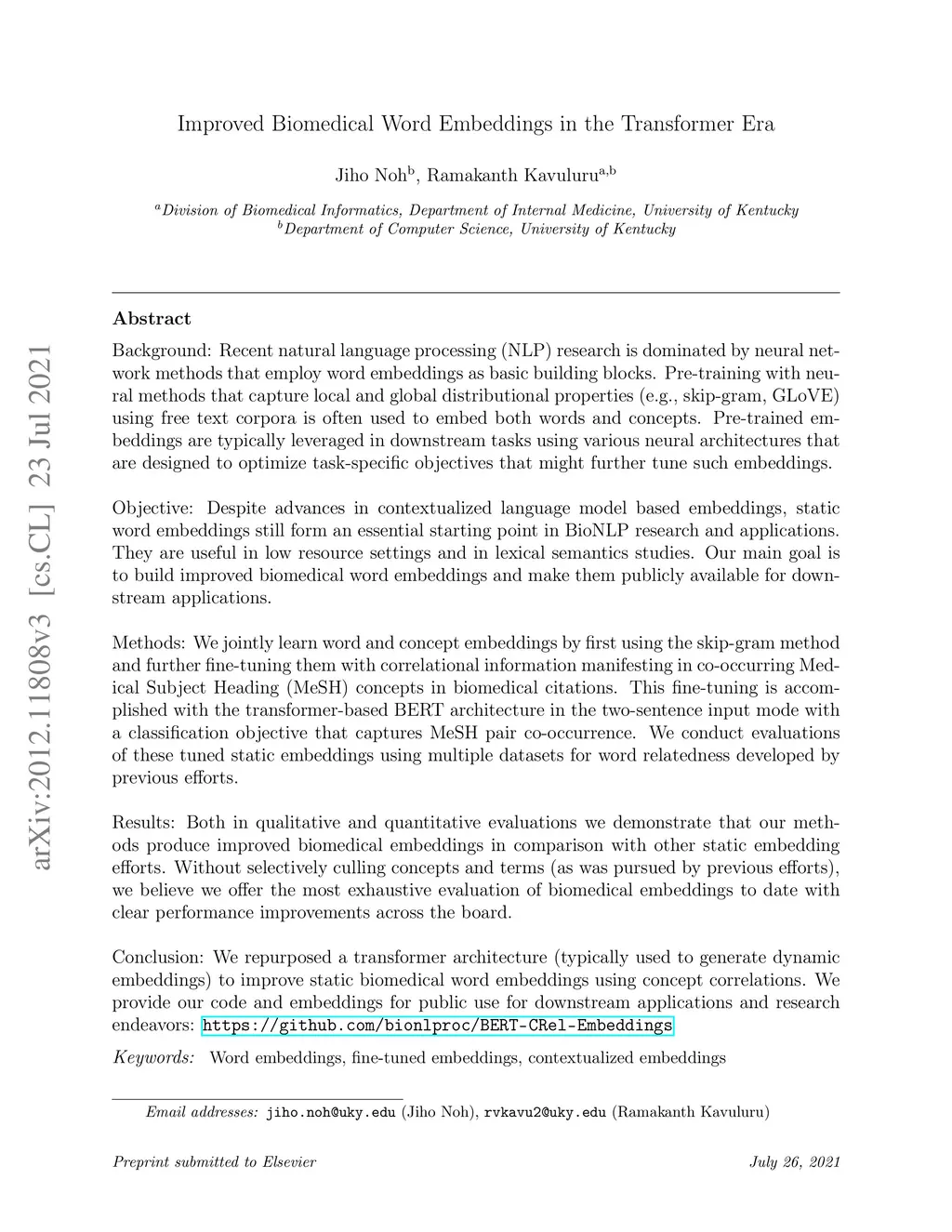 Biomedical word embeddings are usually pre-trained on free text corpora with neural methods that capture local and global distributional properties. They are leveraged in downstream tasks using various neural architectures that are designed to optimize task-specific objectives that might further tune such embeddings. Since 2018, however, there is a marked shift from these static embeddings to contextual embeddings motivated by language models (e.g., ELMo, transformers such as BERT, and ULMFiT). These dynamic embeddings have the added benefit of being able to distinguish homonyms and acronyms given their context. However, static embeddings are still relevant in low resource settings (e.g., smart devices, IoT elements) and to study lexical semantics from a computational linguistics perspective. In this paper, we jointly learn word and concept embeddings by first using the skip-gram method and further fine-tuning them with correlational information manifesting in co-occurring Medical Subject Heading (MeSH) concepts in biomedical citations. This fine-tuning is accomplished with the BERT transformer architecture in the two-sentence input mode with a classification objective that captures MeSH pair co-occurrence. In essence, we repurpose a transformer architecture (typically used to generate dynamic embeddings) to improve static embeddings using concept correlations. We conduct evaluations of these tuned static embeddings using multiple datasets for word relatedness developed by previous efforts. Without selectively culling concepts and terms (as was pursued by previous efforts), we believe we offer the most exhaustive evaluation of static embeddings to date with clear performance improvements across the board. We provide our code and embeddings for public use for downstream applications and research endeavors: https://github.com/bionlproc/BERT-CRel-Embeddings