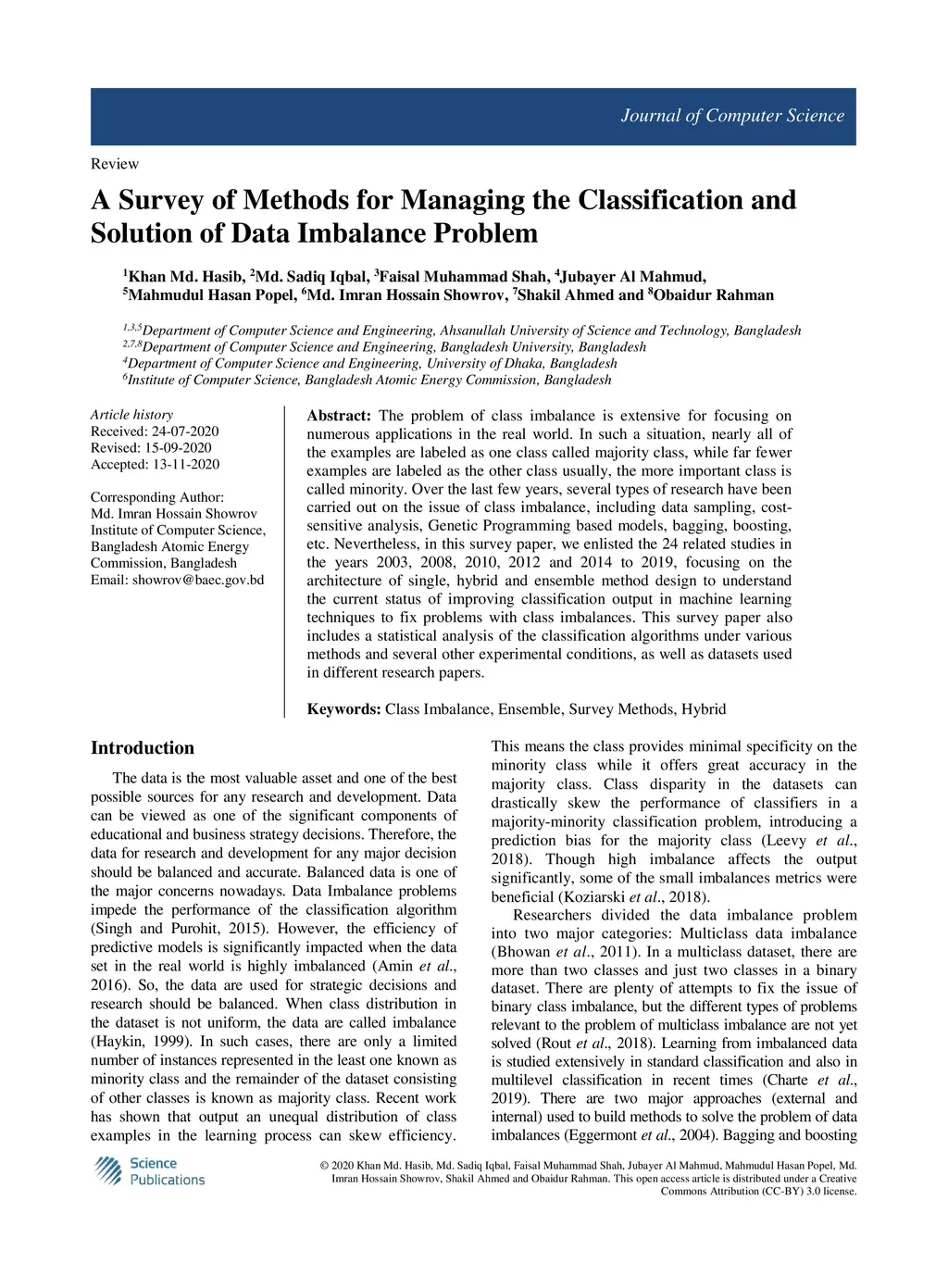 The problem of class imbalance is extensive for focusing on numerous applications in the real world. In such a situation, nearly all of the examples are labeled as one class called majority class, while far fewer examples are labeled as the other class usually, the more important class is called minority. Over the last few years, several types of research have been carried out on the issue of class imbalance, including data sampling, cost-sensitive analysis, Genetic Programming based models, bagging, boosting, etc. Nevertheless, in this survey paper, we enlisted the 24 related studies in the years 2003, 2008, 2010, 2012 and 2014 to 2019, focusing on the architecture of single, hybrid, and ensemble method design to understand the current status of improving classification output in machine learning techniques to fix problems with class imbalances. This survey paper also includes a statistical analysis of the classification algorithms under various methods and several other experimental conditions, as well as datasets used in different research papers.