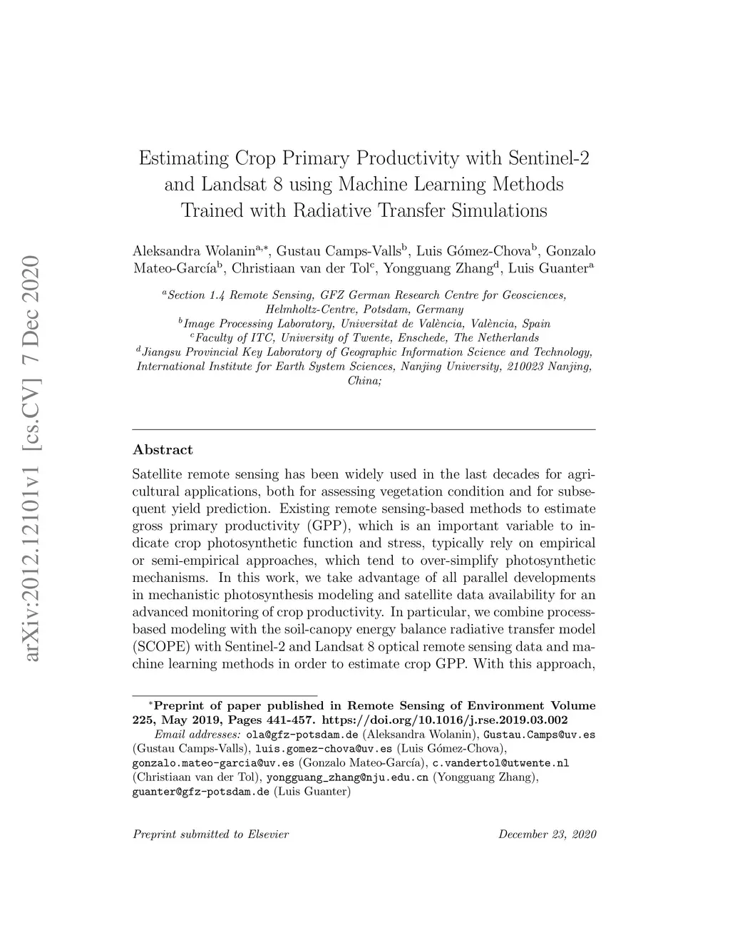 Estimating Crop Primary Productivity with Sentinel-2 and Landsat 8 using