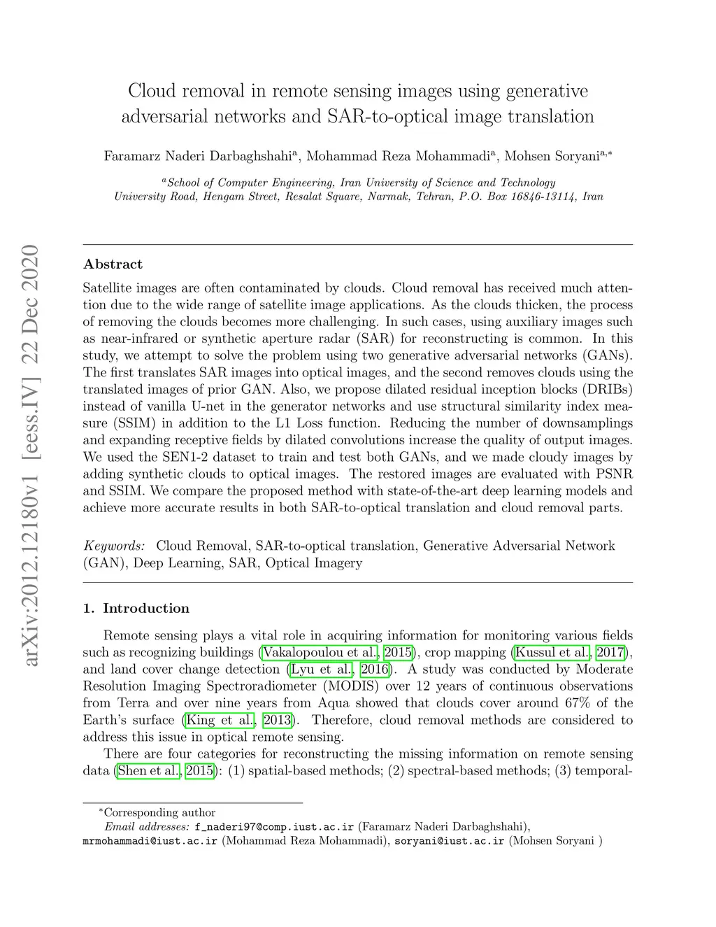 Satellite images are often contaminated by clouds. Cloud removal has received much attention due to the wide range of satellite image applications. As the clouds thicken, the process of removing the clouds becomes more challenging. In such cases, using auxiliary images such as near-infrared or synthetic aperture radar (SAR) for reconstructing is common. In this study, we attempt to solve the problem using two generative adversarial networks (GANs). The first translates SAR images into optical images, and the second removes clouds using the translated images of prior GAN. Also, we propose dilated residual inception blocks (DRIBs) instead of vanilla U-net in the generator networks and use structural similarity index measure (SSIM) in addition to the L1 Loss function. Reducing the number of downsamplings and expanding receptive fields by dilated convolutions increase the quality of output images. We used the SEN1-2 dataset to train and test both GANs, and we made cloudy images by adding synthetic clouds to optical images. The restored images are evaluated with PSNR and SSIM. We compare the proposed method with state-of-the-art deep learning models and achieve more accurate results in both SAR-to-optical translation and cloud removal parts.