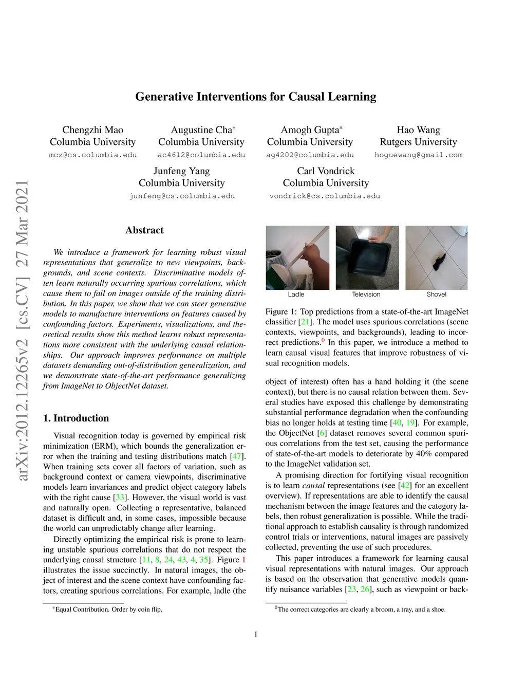 We introduce a framework for learning robust visual representations that generalize to new viewpoints, backgrounds, and scene contexts. Discriminative models often learn naturally occurring spurious correlations, which cause them to fail on images outside of the training distribution. In this paper, we show that we can steer generative models to manufacture interventions on features caused by confounding factors. Experiments, visualizations, and theoretical results show this method learns robust representations more consistent with the underlying causal relationships. Our approach improves performance on multiple datasets demanding out-of-distribution generalization, and we demonstrate state-of-the-art performance generalizing from ImageNet to ObjectNet dataset.