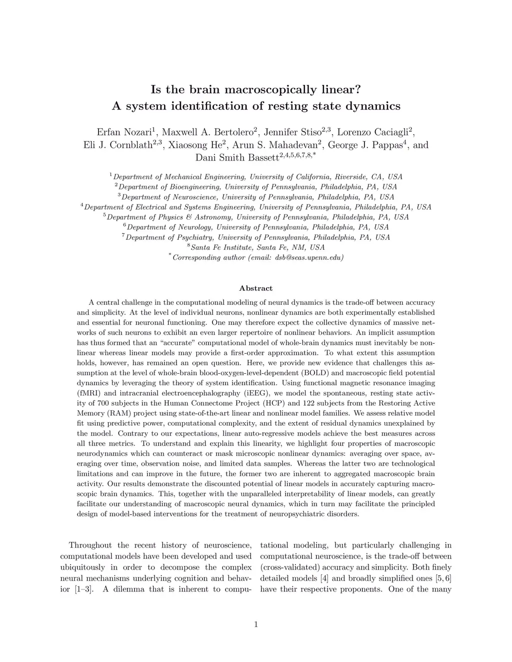 A central challenge in the computational modeling of neural dynamics is the trade-off between accuracy and simplicity. At the level of individual neurons, nonlinear dynamics are both experimentally established and essential for neuronal functioning. An implicit assumption has thus formed that an accurate computational model of whole-brain dynamics must also be highly nonlinear, whereas linear models may provide a first-order approximation. Here, we provide a rigorous and data-driven investigation of this hypothesis at the level of whole-brain blood-oxygen-level-dependent (BOLD) and macroscopic field potential dynamics by leveraging the theory of system identification. Using functional MRI (fMRI) and intracranial EEG (iEEG), we model the resting state activity of 700 subjects in the Human Connectome Project (HCP) and 122 subjects from the Restoring Active Memory (RAM) project using state-of-the-art linear and nonlinear model families. We assess relative model fit using predictive power, computational complexity, and the extent of residual dynamics unexplained by the model. Contrary to our expectations, linear auto-regressive models achieve the best measures across all three metrics, eliminating the trade-off between accuracy and simplicity. To understand and explain this linearity, we highlight four properties of macroscopic neurodynamics which can counteract or mask microscopic nonlinear dynamics: averaging over space, averaging over time, observation noise, and limited data samples. Whereas the latter two are technological limitations and can improve in the future, the former two are inherent to aggregated macroscopic brain activity. Our results, together with the unparalleled interpretability of linear models, can greatly facilitate our understanding of macroscopic neural dynamics and the principled design of model-based interventions for the treatment of neuropsychiatric disorders.
