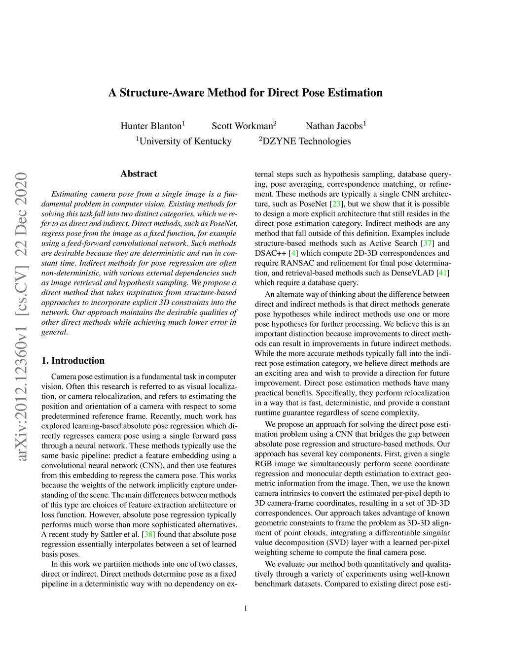Estimating camera pose from a single image is a fundamental problem in computer vision. Existing methods for solving this task fall into two distinct categories, which we refer to as direct and indirect. Direct methods, such as PoseNet, regress pose from the image as a fixed function, for example using a feed-forward convolutional network. Such methods are desirable because they are deterministic and run in constant time. Indirect methods for pose regression are often non-deterministic, with various external dependencies such as image retrieval and hypothesis sampling. We propose a direct method that takes inspiration from structure-based approaches to incorporate explicit 3D constraints into the network. Our approach maintains the desirable qualities of other direct methods while achieving much lower error in general.