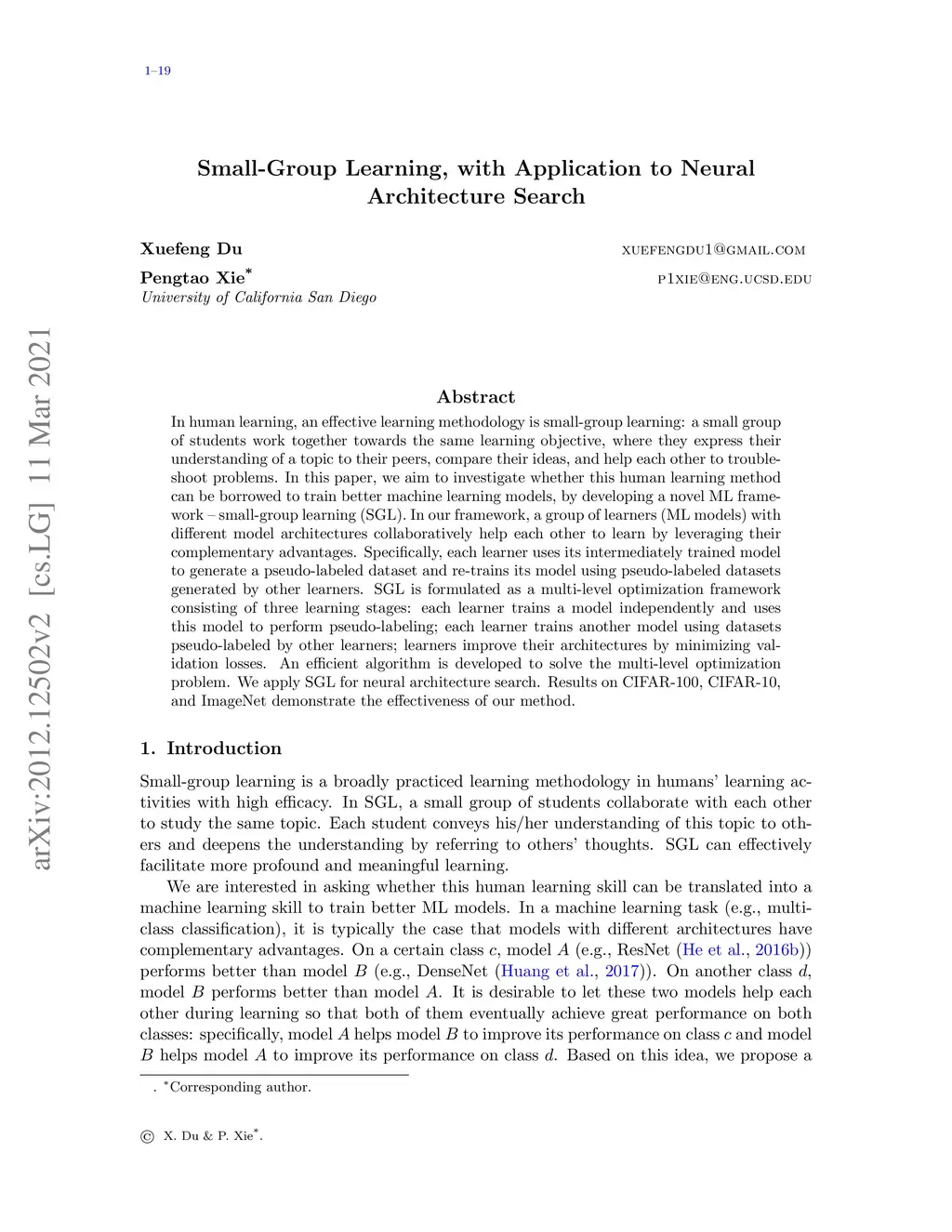 In human learning, an effective learning methodology is small-group learning: a small group of students work together towards the same learning objective, where they express their understanding of a topic to their peers, compare their ideas, and help each other to trouble-shoot problems. In this paper, we aim to investigate whether this human learning method can be borrowed to train better machine learning models, by developing a novel ML framework -- small-group learning (SGL). In our framework, a group of learners (ML models) with different model architectures collaboratively help each other to learn by leveraging their complementary advantages. Specifically, each learner uses its intermediately trained model to generate a pseudo-labeled dataset and re-trains its model using pseudo-labeled datasets generated by other learners. SGL is formulated as a multi-level optimization framework consisting of three learning stages: each learner trains a model independently and uses this model to perform pseudo-labeling; each learner trains another model using datasets pseudo-labeled by other learners; learners improve their architectures by minimizing validation losses. An efficient algorithm is developed to solve the multi-level optimization problem. We apply SGL for neural architecture search. Results on CIFAR-100, CIFAR-10, and ImageNet demonstrate the effectiveness of our method.
