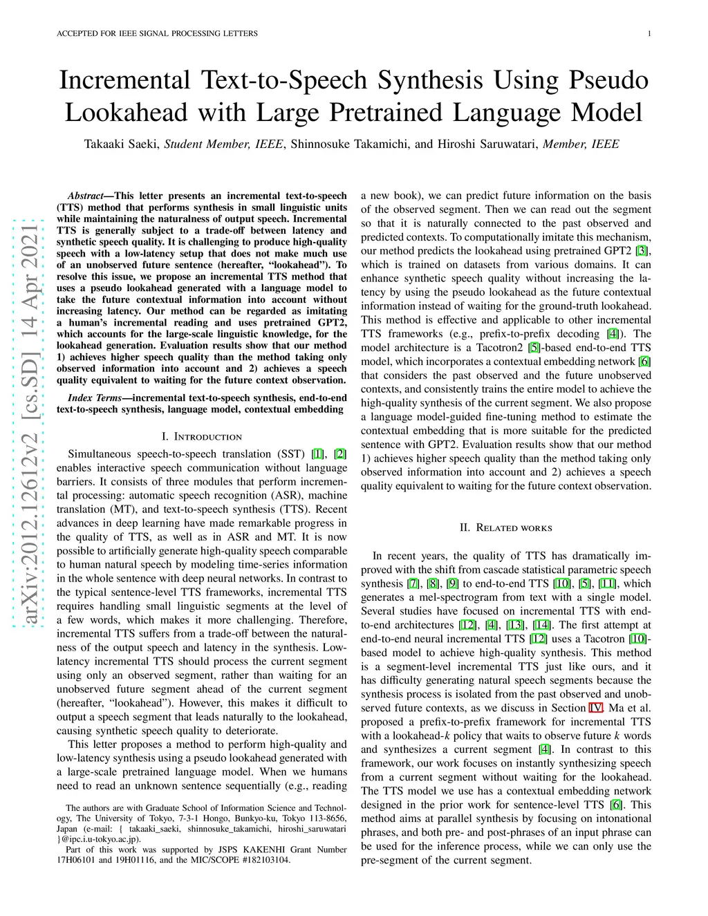 Incremental Text-to-Speech Synthesis Using Pseudo Lookahead with Large