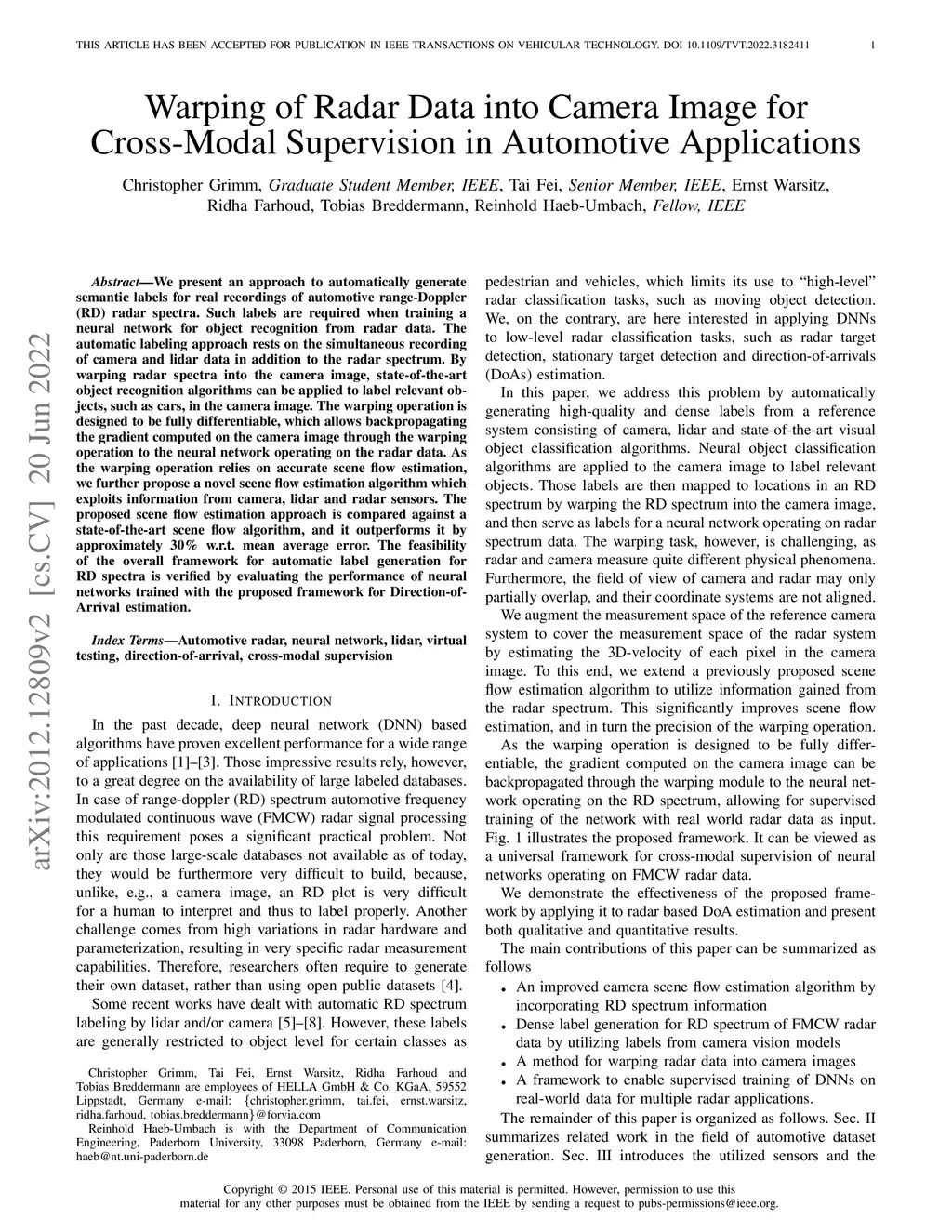 Warping of Radar Data into Camera Image for Cross-Modal Supervision in