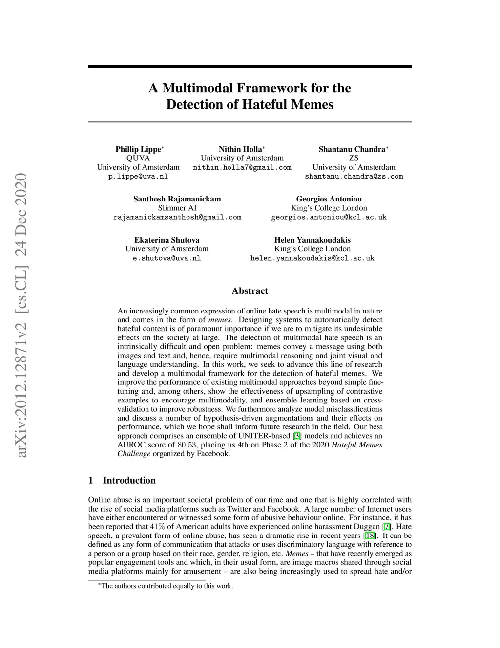 A Multimodal Framework for the Detection of Hateful Memes