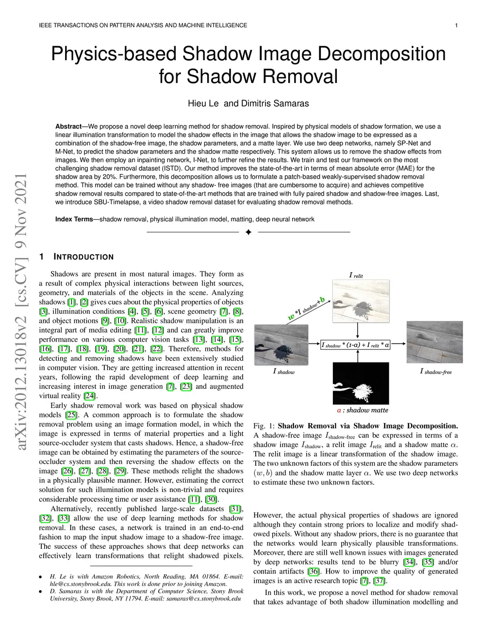 We propose a novel deep learning method for shadow removal. Inspired by physical models of shadow formation, we use a linear illumination transformation to model the shadow effects in the image that allows the shadow image to be expressed as a combination of the shadow-free image, the shadow parameters, and a matte layer. We use two deep networks, namely SP-Net and M-Net, to predict the shadow parameters and the shadow matte respectively. This system allows us to remove the shadow effects from images. We then employ an inpainting network, I-Net, to further refine the results. We train and test our framework on the most challenging shadow removal dataset (ISTD). Our method improves the state-of-the-art in terms of root mean square error (RMSE) for the shadow area by 20\%. Furthermore, this decomposition allows us to formulate a patch-based weakly-supervised shadow removal method. This model can be trained without any shadow-free images (that are cumbersome to acquire) and achieves competitive shadow removal results compared to state-of-the-art methods that are trained with fully paired shadow and shadow-free images. Last, we introduce SBU-Timelapse, a video shadow removal dataset for evaluating shadow removal methods.