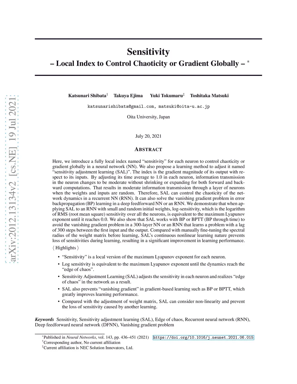 Here, we introduce a fully local index named "sensitivity" for each neuron to control chaoticity or gradient globally in a neural network (NN). We also propose a learning method to adjust it named "sensitivity adjustment learning (SAL)". The index is the gradient magnitude of its output with respect to its inputs. By adjusting its time average to 1.0 in each neuron, information transmission in the neuron changes to be moderate without shrinking or expanding for both forward and backward computations. That results in moderate information transmission through a layer of neurons when the weights and inputs are random. Therefore, SAL can control the chaoticity of the network dynamics in a recurrent NN (RNN). It can also solve the vanishing gradient problem in error backpropagation (BP) learning in a deep feedforward NN or an RNN. We demonstrate that when applying SAL to an RNN with small and random initial weights, log-sensitivity, which is the logarithm of RMS (root mean square) sensitivity over all the neurons, is equivalent to the maximum Lyapunov exponent until it reaches 0.0. We also show that SAL works with BP or BPTT (BP through time) to avoid the vanishing gradient problem in a 300-layer NN or an RNN that learns a problem with a lag of 300 steps between the first input and the output. Compared with manually fine-tuning the spectral radius of the weight matrix before learning, SAL's continuous nonlinear learning nature prevents loss of sensitivities during learning, resulting in a significant improvement in learning performance.