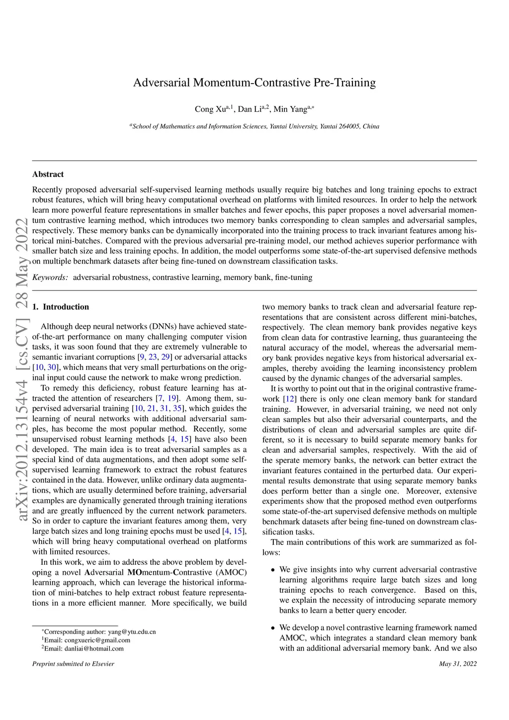 Adversarial Momentum-Contrastive Pre-Training