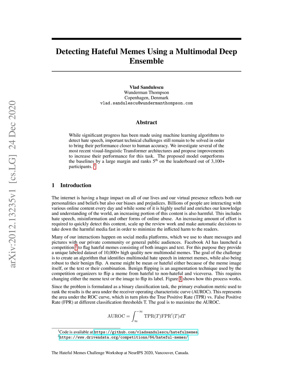 While significant progress has been made using machine learning algorithms to detect hate speech, important technical challenges still remain to be solved in order to bring their performance closer to human accuracy. We investigate several of the most recent visual-linguistic Transformer architectures and propose improvements to increase their performance for this task. The proposed model outperforms the baselines by a large margin and ranks 5 on the leaderboard out of 3,100+ participants.