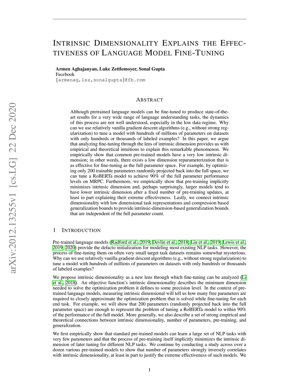 Although pretrained language models can be fine-tuned to produce state-of-the-art results for a very wide range of language understanding tasks, the dynamics of this process are not well understood, especially in the low data regime. Why can we use relatively vanilla gradient descent algorithms (e.g., without strong regularization) to tune a model with hundreds of millions of parameters on datasets with only hundreds or thousands of labeled examples? In this paper, we argue that analyzing fine-tuning through the lens of intrinsic dimension provides us with empirical and theoretical intuitions to explain this remarkable phenomenon. We empirically show that common pre-trained models have a very low intrinsic dimension; in other words, there exists a low dimension reparameterization that is as effective for fine-tuning as the full parameter space. For example, by optimizing only 200 trainable parameters randomly projected back into the full space, we can tune a RoBERTa model to achieve 90\% of the full parameter performance levels on MRPC. Furthermore, we empirically show that pre-training implicitly minimizes intrinsic dimension and, perhaps surprisingly, larger models tend to have lower intrinsic dimension after a fixed number of pre-training updates, at least in part explaining their extreme effectiveness. Lastly, we connect intrinsic dimensionality with low dimensional task representations and compression based generalization bounds to provide intrinsic-dimension-based generalization bounds that are independent of the full parameter count.