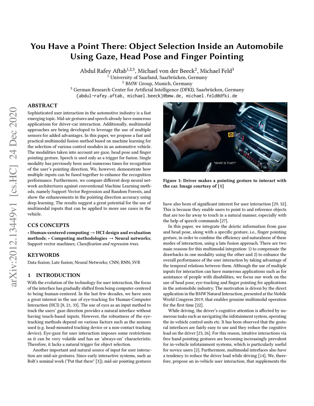 Sophisticated user interaction in the automotive industry is a fast emerging topic. Mid-air gestures and speech already have numerous applications for driver-car interaction. Additionally, multimodal approaches are being developed to leverage the use of multiple sensors for added advantages. In this paper, we propose a fast and practical multimodal fusion method based on machine learning for the selection of various control modules in an automotive vehicle. The modalities taken into account are gaze, head pose and finger pointing gesture. Speech is used only as a trigger for fusion. Single modality has previously been used numerous times for recognition of the user's pointing direction. We, however, demonstrate how multiple inputs can be fused together to enhance the recognition performance. Furthermore, we compare different deep neural network architectures against conventional Machine Learning methods, namely Support Vector Regression and Random Forests, and show the enhancements in the pointing direction accuracy using deep learning. The results suggest a great potential for the use of multimodal inputs that can be applied to more use cases in the vehicle.
