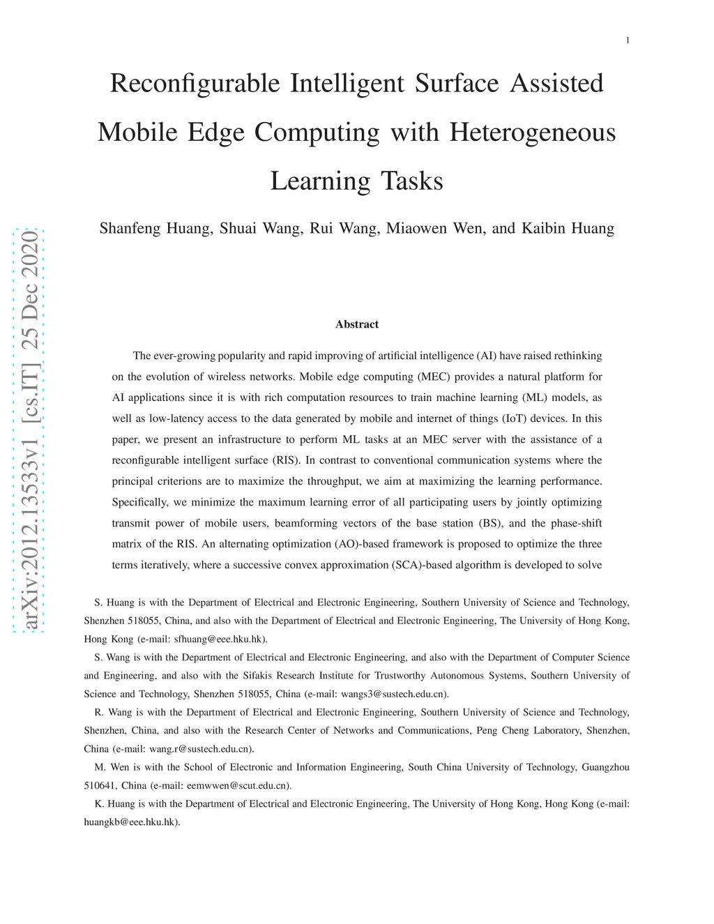 The ever-growing popularity and rapid improving of artificial intelligence (AI) have raised rethinking on the evolution of wireless networks. Mobile edge computing (MEC) provides a natural platform for AI applications since it is with rich computation resources to train machine learning (ML) models, as well as low-latency access to the data generated by mobile and internet of things (IoT) devices. In this paper, we present an infrastructure to perform ML tasks at an MEC server with the assistance of a reconfigurable intelligent surface (RIS). In contrast to conventional communication systems where the principal criterions are to maximize the throughput, we aim at maximizing the learning performance. Specifically, we minimize the maximum learning error of all participating users by jointly optimizing transmit power of mobile users, beamforming vectors of the base station (BS), and the phase-shift matrix of the RIS. An alternating optimization (AO)-based framework is proposed to optimize the three terms iteratively, where a successive convex approximation (SCA)-based algorithm is developed to solve the power allocation problem, closed-form expressions of the beamforming vectors are derived, and an alternating direction method of multipliers (ADMM)-based algorithm is designed together with an error level searching (ELS) framework to effectively solve the challenging nonconvex optimization problem of the phase-shift matrix. Simulation results demonstrate significant gains of deploying an RIS and validate the advantages of our proposed algorithms over various benchmarks. Lastly, a unified communication-training-inference platform is developed based on the CARLA platform and the SECOND network, and a use case (3D object detection in autonomous driving) for the proposed scheme is demonstrated on the developed platform.