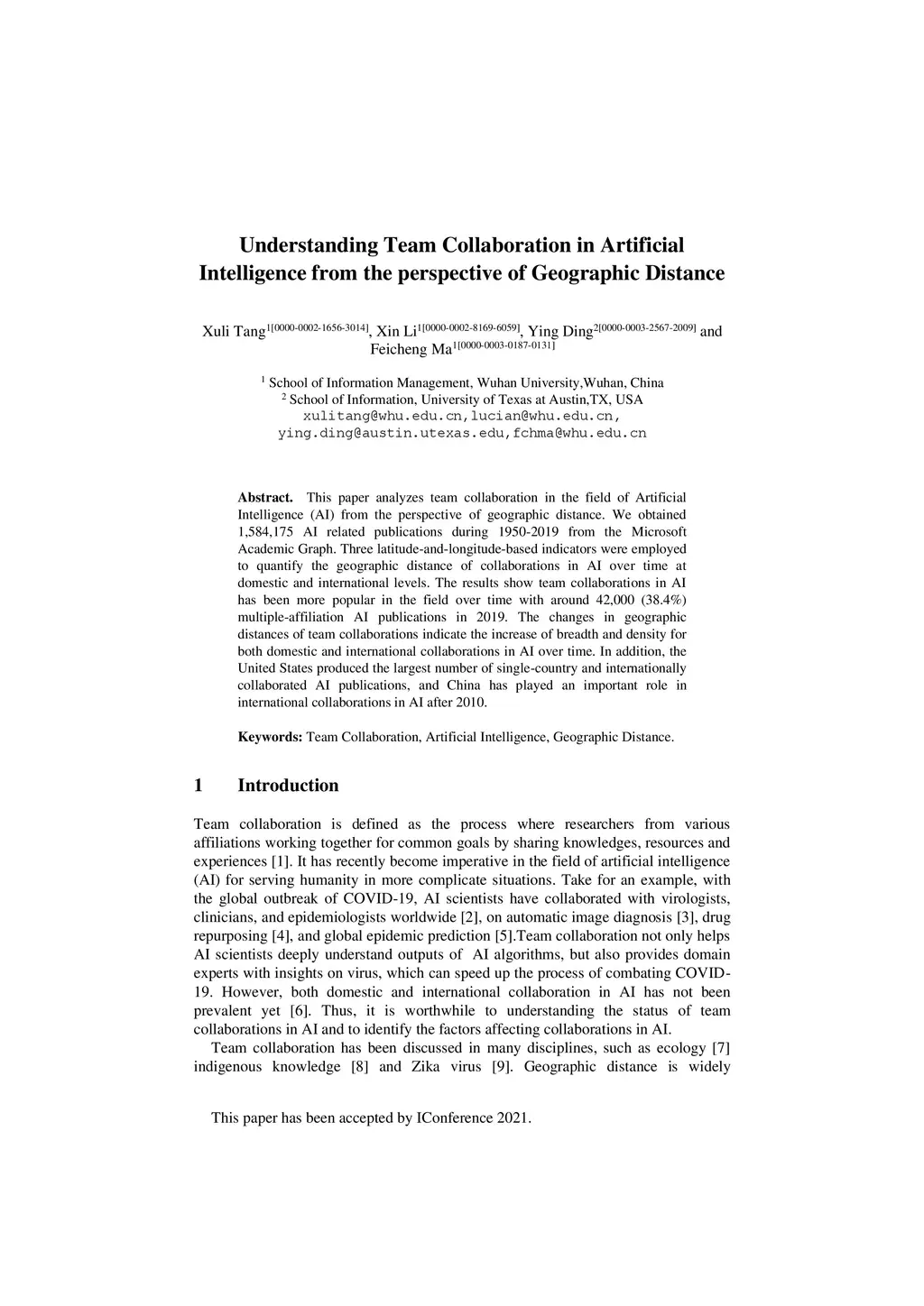 This paper analyzes team collaboration in the field of Artificial Intelligence (AI) from the perspective of geographic distance. We obtained 1,584,175 AI related publications during 1950-2019 from the Microsoft Academic Graph. Three latitude-and-longitude-based indicators were employed to quantify the geographic distance of collaborations in AI over time at domestic and international levels. The results show team collaborations in AI has been more popular in the field over time with around 42,000 (38.4%) multiple-affiliation AI publications in 2019. The changes in geographic distances of team collaborations indicate the increase of breadth and density for both domestic and international collaborations in AI over time. In addition, the United States produced the largest number of single-country and internationally collaborated AI publications, and China has played an important role in international collaborations in AI after 2010.