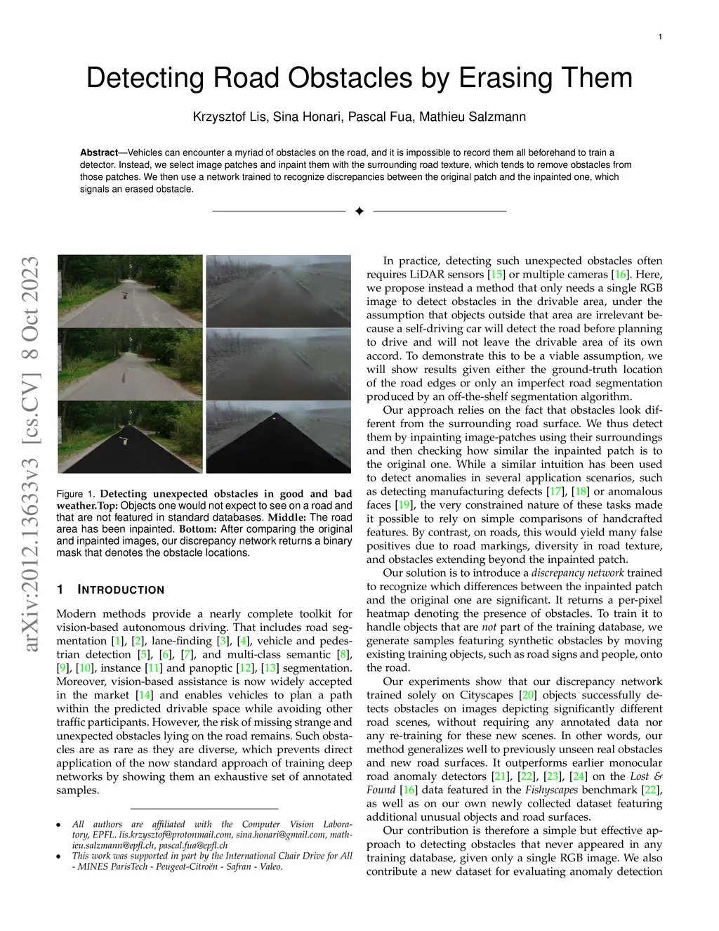 Vehicles can encounter a myriad of obstacles on the road, and it is impossible to record them all beforehand to train a detector. Instead, we select image patches and inpaint them with the surrounding road texture, which tends to remove obstacles from those patches. We then use a network trained to recognize discrepancies between the original patch and the inpainted one, which signals an erased obstacle.