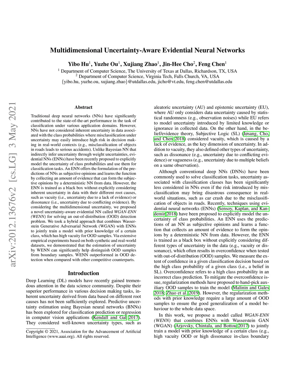 Traditional deep neural networks (NNs) have significantly contributed to the state-of-the-art performance in the task of classification under various application domains. However, NNs have not considered inherent uncertainty in data associated with the class probabilities where misclassification under uncertainty may easily introduce high risk in decision making in real-world contexts (e.g., misclassification of objects in roads leads to serious accidents). Unlike Bayesian NN that indirectly infer uncertainty through weight uncertainties, evidential NNs (ENNs) have been recently proposed to explicitly model the uncertainty of class probabilities and use them for classification tasks. An ENN offers the formulation of the predictions of NNs as subjective opinions and learns the function by collecting an amount of evidence that can form the subjective opinions by a deterministic NN from data. However, the ENN is trained as a black box without explicitly considering inherent uncertainty in data with their different root causes, such as vacuity (i.e., uncertainty due to a lack of evidence) or dissonance (i.e., uncertainty due to conflicting evidence). By considering the multidimensional uncertainty, we proposed a novel uncertainty-aware evidential NN called WGAN-ENN (WENN) for solving an out-of-distribution (OOD) detection problem. We took a hybrid approach that combines Wasserstein Generative Adversarial Network (WGAN) with ENNs to jointly train a model with prior knowledge of a certain class, which has high vacuity for OOD samples. Via extensive empirical experiments based on both synthetic and real-world datasets, we demonstrated that the estimation of uncertainty by WENN can significantly help distinguish OOD samples from boundary samples. WENN outperformed in OOD detection when compared with other competitive counterparts.