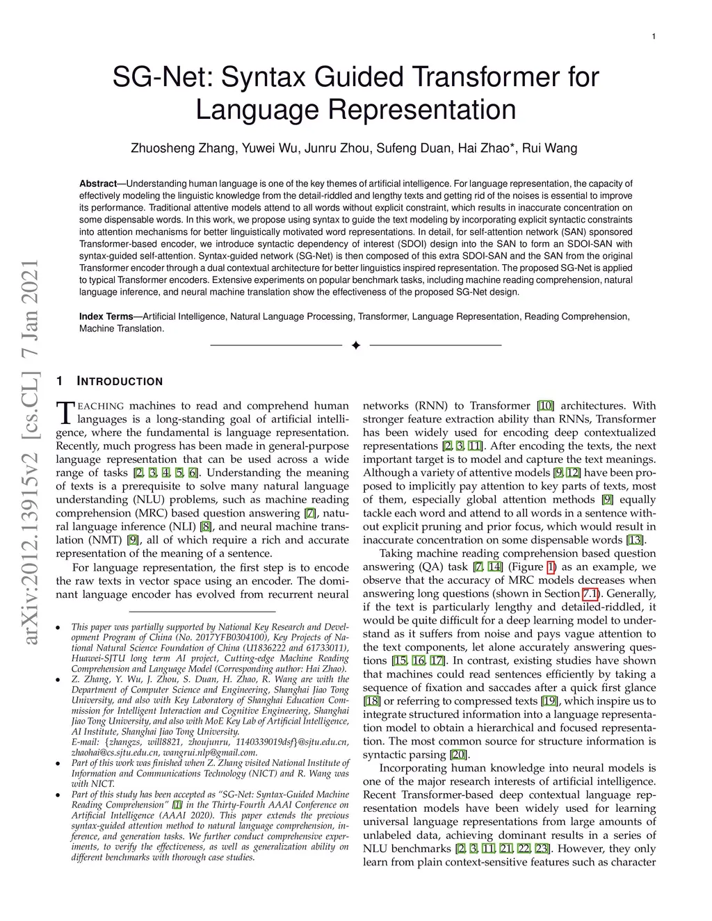 Understanding human language is one of the key themes of artificial intelligence. For language representation, the capacity of effectively modeling the linguistic knowledge from the detail-riddled and lengthy texts and getting rid of the noises is essential to improve its performance. Traditional attentive models attend to all words without explicit constraint, which results in inaccurate concentration on some dispensable words. In this work, we propose using syntax to guide the text modeling by incorporating explicit syntactic constraints into attention mechanisms for better linguistically motivated word representations. In detail, for self-attention network (SAN) sponsored Transformer-based encoder, we introduce syntactic dependency of interest (SDOI) design into the SAN to form an SDOI-SAN with syntax-guided self-attention. Syntax-guided network (SG-Net) is then composed of this extra SDOI-SAN and the SAN from the original Transformer encoder through a dual contextual architecture for better linguistics inspired representation. The proposed SG-Net is applied to typical Transformer encoders. Extensive experiments on popular benchmark tasks, including machine reading comprehension, natural language inference, and neural machine translation show the effectiveness of the proposed SG-Net design.