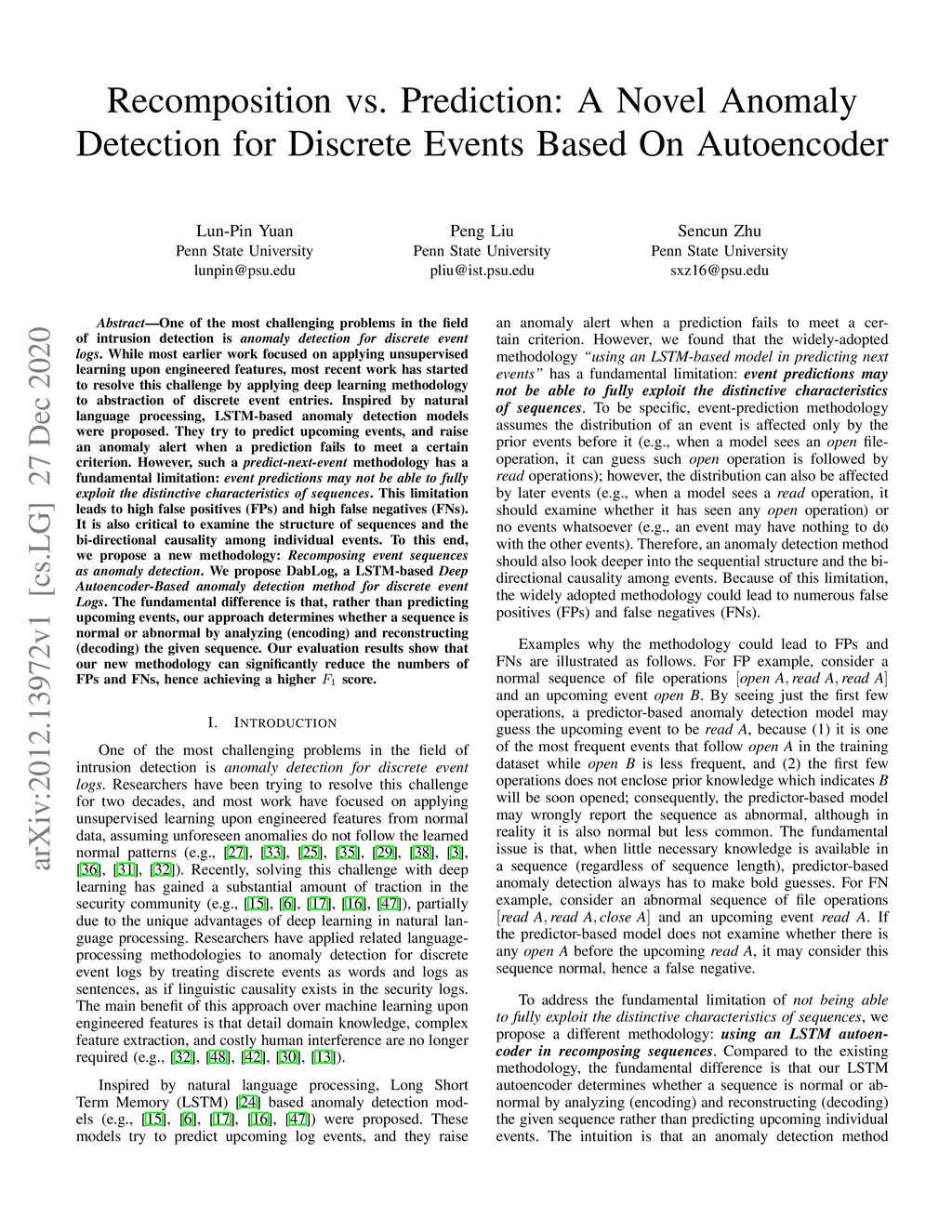 One of the most challenging problems in the field of intrusion detection is anomaly detection for discrete event logs. While most earlier work focused on applying unsupervised learning upon engineered features, most recent work has started to resolve this challenge by applying deep learning methodology to abstraction of discrete event entries. Inspired by natural language processing, LSTM-based anomaly detection models were proposed. They try to predict upcoming events, and raise an anomaly alert when a prediction fails to meet a certain criterion. However, such a predict-next-event methodology has a fundamental limitation: event predictions may not be able to fully exploit the distinctive characteristics of sequences. This limitation leads to high false positives (FPs) and high false negatives (FNs). It is also critical to examine the structure of sequences and the bi-directional causality among individual events. To this end, we propose a new methodology: Recomposing event sequences as anomaly detection. We propose DabLog, a Deep Autoencoder-Based anomaly detection method for discrete event Logs. The fundamental difference is that, rather than predicting upcoming events, our approach determines whether a sequence is normal or abnormal by analyzing (encoding) and reconstructing (decoding) the given sequence. Our evaluation results show that our new methodology can significantly reduce the numbers of FPs and FNs, hence achieving a higher score.