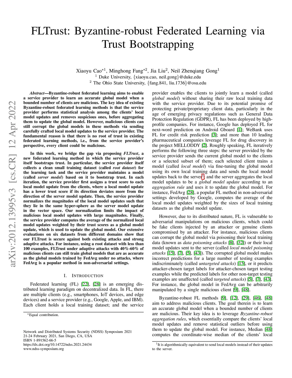 FLTrust: Byzantine-robust Federated Learning via Trust Bootstrapping