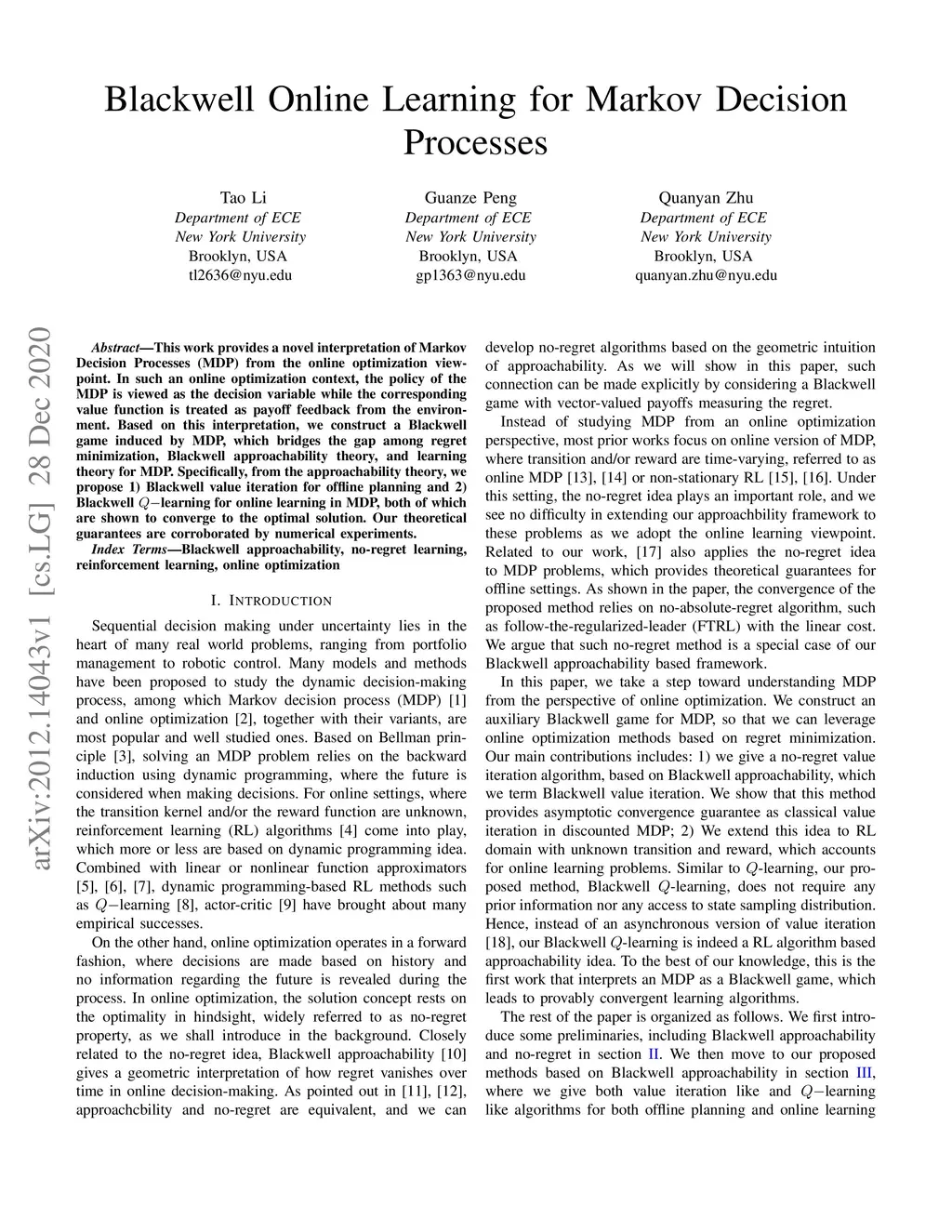 Blackwell Online Learning for Markov Decision Processes