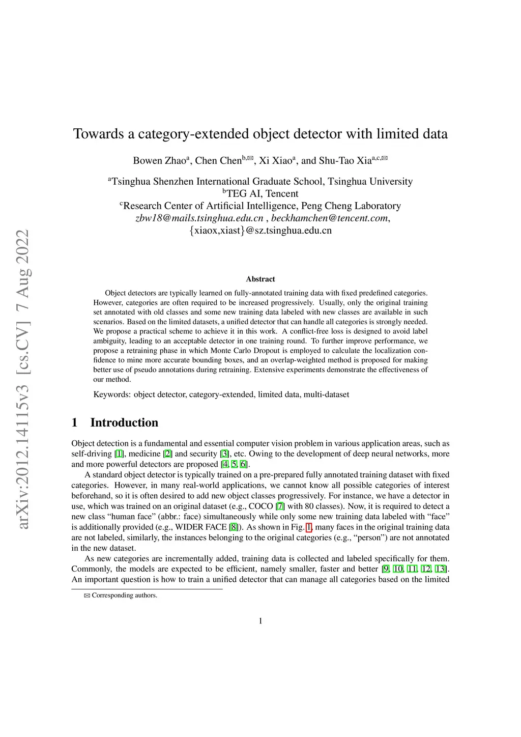 Object detectors are typically learned on fully-annotated training data with fixed predefined categories. However, categories are often required to be increased progressively. Usually, only the original training set annotated with old classes and some new training data labeled with new classes are available in such scenarios. Based on the limited datasets, a unified detector that can handle all categories is strongly needed. We propose a practical scheme to achieve it in this work. A conflict-free loss is designed to avoid label ambiguity, leading to an acceptable detector in one training round. To further improve performance, we propose a retraining phase in which Monte Carlo Dropout is employed to calculate the localization confidence to mine more accurate bounding boxes, and an overlap-weighted method is proposed for making better use of pseudo annotations during retraining. Extensive experiments demonstrate the effectiveness of our method.